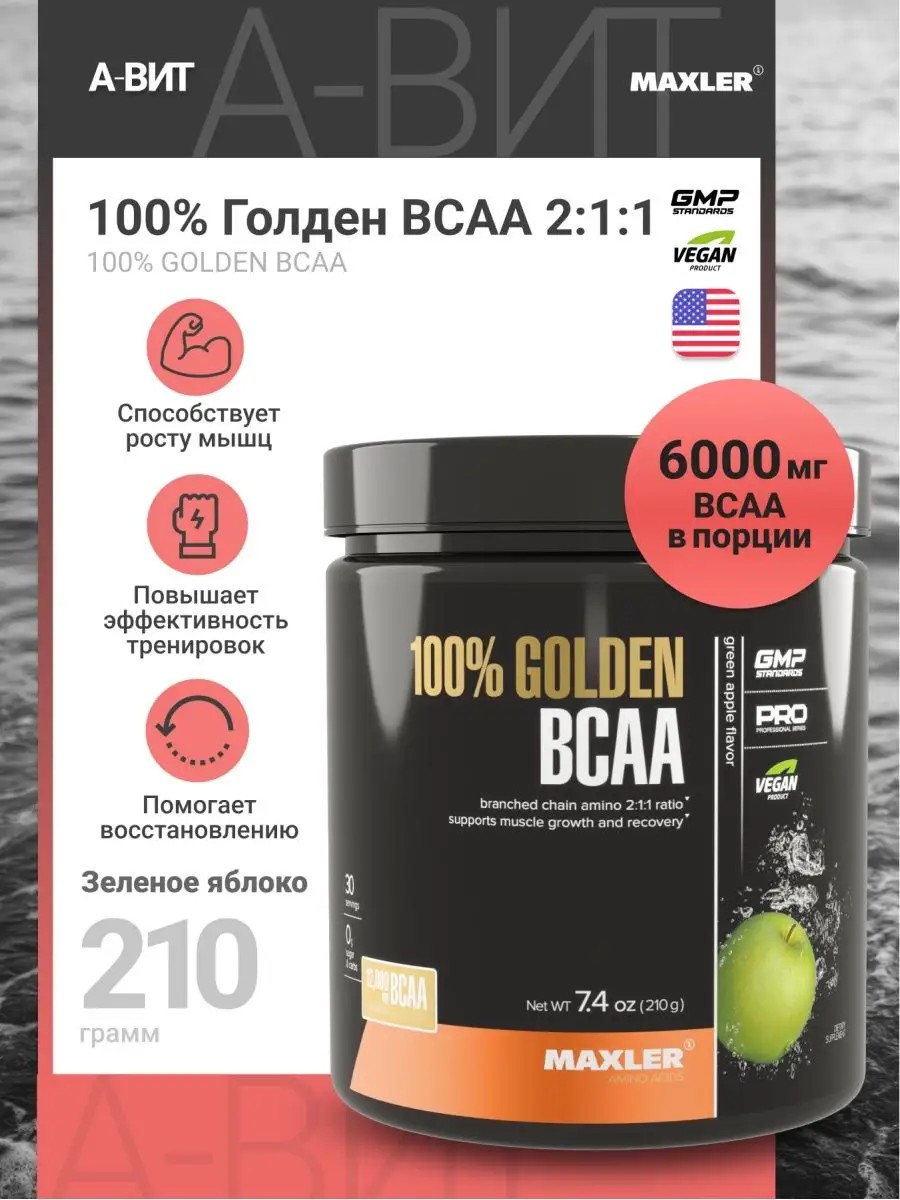 Аминокислоты порошок Maxler 100% Golden BCAA 210 гр вкус яблоко - формула, содержащая аминокислоты с разветвленными цепями ( BCAA ) в соотношении 2:1:1 ( Лейцин, Изолейцин, Валин). ВСАА основной материал для построения и роста мышц. Прием BCAA 2:1:1 необходим любому атлету - они играют важную роль в увеличении мышечной массы, в восполнении энергетических запасов, сжигании жира и защите мышц от разрушения. Организм не вырабатывает данные аминокислоты, поэтому важно получать bca в виде специальных добавок. БЦАА порошок от Maxler Golden BCAA хорошо усваивается, быстро снабжая мышцы аминокислотами. Рекомендуем совмещать прием БЦА с Creatine ( креатин ) для силы и восстановления, с Glucosamine Chondroitin MSM ( глюкозамин ) для защиты сустав. Голден БЦА от Макслер представлен в различных вкусовых вариациях, что позволяет насладиться не только полезным, но и вкусным напитком. **Применение:** смешайте 1 порцию порошка (7 г - 3/4 мерной ложки ) с 300 мл воды. Принимайте 2 порции в день: одну за полчаса до тренировки, вторую - после. Также в нашем магазине вы можете купить другие аминокислоты в капсулах, спортивные витамины для похудения, спортивное питание для мужчин и женщин, жиросжигатели, претренировочные комплексы, бады для суставов. В том числе: креатин, bcaa / всаа, омега 3, коллаген, изотоники / электролиты, аргинин, бустер тестостерона, глютамин и другие пищевые добавки.