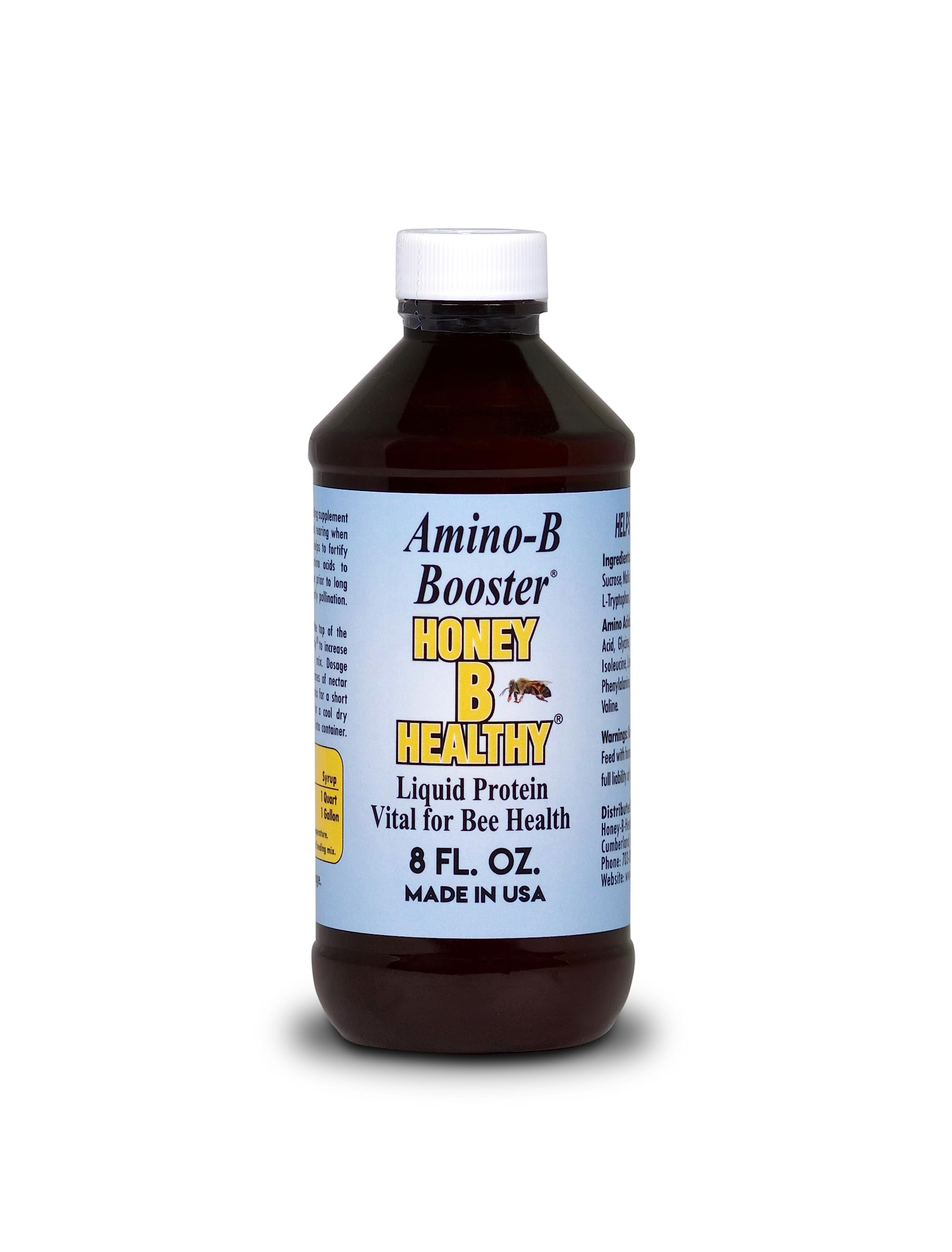 AMINO-B BOOSTER is a liquid protein that provides vital amino-acids! It is essential for bee longevity BROOD PRODUCTION. It helps fortify overwintered pollen. Use for early spring feeding to build up brood for pollination and to maximize production. Use to rapidly build up packages, nucs and swarms. Use for feeding bees during times of colony dwindling, late winter, mid-summer, dearth's of nectar and pollen or droughts. AMINO-B BOOSTER, providing all necessary amino acids, is a must for QUEEN PRODUCTION: with AMINO-B BOOSTER, the nurse bees make the highest quality bee milk and royal jelly. During times of poor pollen or late winter, bees can utilize nutrients like protein from their bodies to make royal jelly for brood rearing however, by doing this, the bees are weakened, and their immune systems degrade because they are not maintaining proper nutrient levels. This often reduces their longevity and provides an opening for diseases like viruses. AMINO-B BOOSTER is also a great additive to help reduce pollen stress, especially when bees are producing brood and the available pollen sources are limited in quality, or the pollen is lacking in amino acids causing dying yellow (snot) brood. Use AMINO-B BOOSTER as a 'Protein Drench' when bees take pollen patties very slowly: spray or drizzle the AMINO-B BOOSTER AND HONEY B HEALTHY into the brood area. Reduce 'protein stress' when bees are producing brood and available pollen sources are limited in quantity and quality of essential amino acids. Use AMINO-B BOOSTER along with HONEY B HEALTHY ORIGINAL. When used in combination, it greatly improves the rate of protein uptake by honey bees because of the HONEY B HEALTHY formulation and amino acids in AMINO-B BOOSTER. HONEY B HEALTHY and AMINO-B BOOSTER make up a one-two punch: HONEY B HEALTHY helps the bees build up and maintain healthy immune systems improving their health while also preserving the feeding mix.