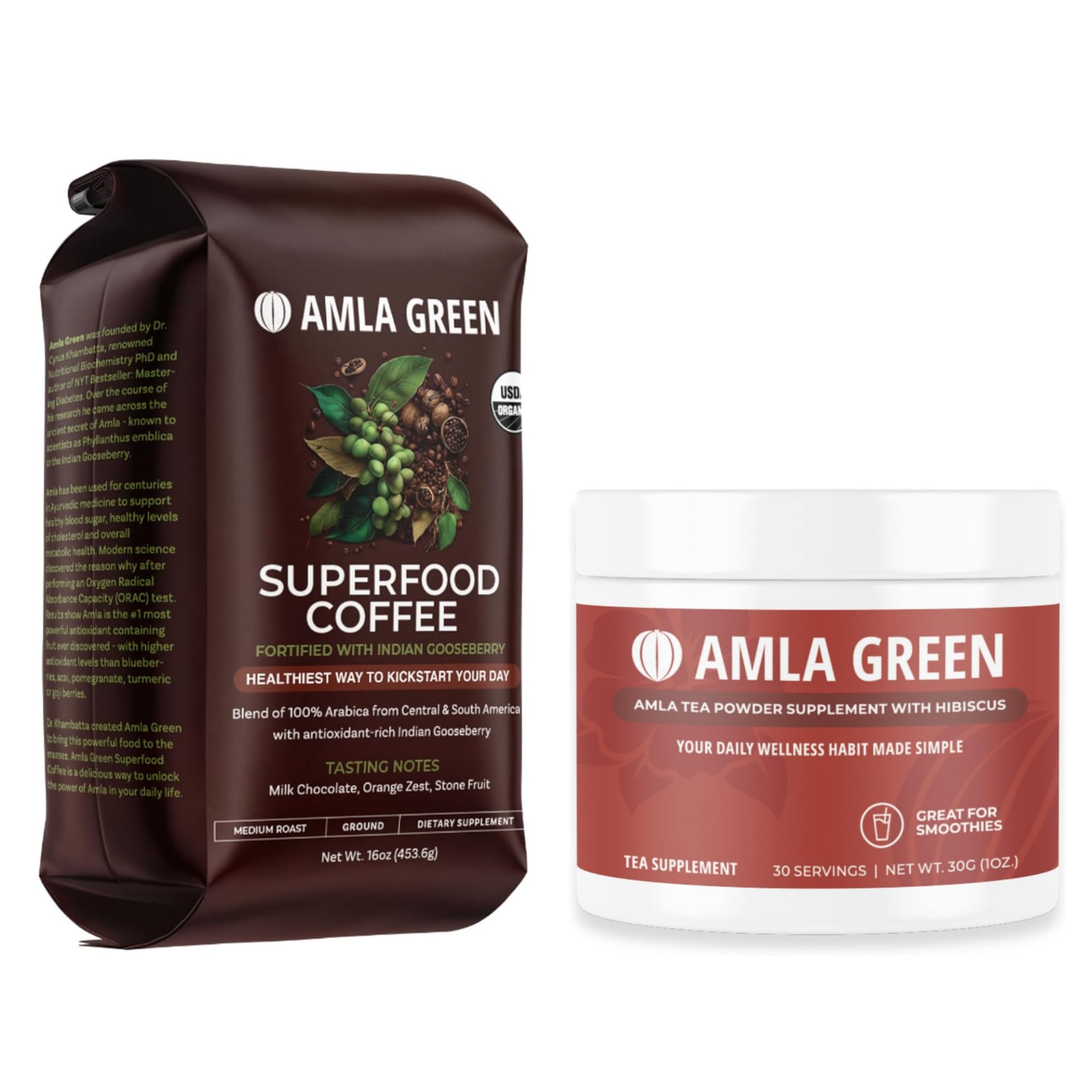 THE ORIGINAL 20X CONCENTRATED AMLA SUPPLEMENT: Amla Green is your daily superfood powder supplement delivering unmatched antioxidative support through 20x concentrated amla with an ORAC Value of 261,500, which is 75 times higher than goji berries. Supported by published research, including clinical trials, amla has shown positive results for youthful benefits and critical areas of vitality and health. DAILY SUPERFOOD TEA: With over 10,000 daily active users, Amla Green is the go-to source for antioxidative benefits mixed into smoothies, breakfast bowls, or as a hot or cold morning or evening tea. One scoop per day provides a natural method for supporting your most critical areas of health, with a smoother taste and better flavor than traditional amla supplements. WILD HARVESTED, STANDARDIZED, TESTED: We source wild-harvested amla berries from India, and test for heavy metals and impurities to ensure that our product meets all US standards. Our Amla Green standardization process helps avoid bottle-to-bottle variability and ensures the highest potency of our unique 20x amla concentrated formula. Amla Green is non-GMO, vegan, gluten free, peanut free, and soy free. FORMULATED BY CYRUS KHAMBATTA, PHD: Cyrus Khambatta, PhD is a New York Times bestselling author and an internationally recognized nutrition and fitness coach who has helped more than 10,000 people improve critical areas of health using food as medicine. He earned his PhD in Nutritional Biochemistry from UC Berkeley and is the co-founder of Amla Green, a company devoted to creating all natural supplements with specific ingredients that offer powerful health benefits. SUPPORTED BY RESEARCH BACKED BY OUR GUARANTEE: Amla Green uses its superfood ingredients to support cellular health, immunity, and protection from free radicals. As a natural way to improve overall health and wellbeing, Amla Green is best used on a daily basis and often used 2-3 times per day.SUPPORTED BY RESEARCH BACKED BY OUR GUARANTEE: Amla Green uses its superfood ingredients to support cellular health, immunity, and protection from free radicals. As a natural way to improve overall health and wellbeing, Amla Green is best used on a daily basis and often used 2-3 times per day. If, for any reason, you're not satisfied with your purchase, we offer our customers a 30 day unconditional money back guarantee. FORMULATED BY CYRUS KHAMBATTA, PHD: Cyrus Khambatta, PhD is a New York Times bestselling author and an internationally recognized nutrition and fitness coach who has helped more than 10,000 people improve critical areas of health using food as medicine. He earned his PhD in Nutritional Biochemistry from UC Berkeley and is the co-founder of Amla Green, a company devoted to creating all natural supplements with specific ingredients that offer powerful health benefits. WILD HARVESTED, STANDARDIZED, TESTED: We source wild-harvested amla berries from India, and test for heavy metals and impurities to ensure that our product meets all US standards. Our Amla Green standardization process helps avoid variability and ensures the highest potency of our unique 20x amla concentrated formula. MORNING COFFEE MADE BETTER: Amla-infused 100 Arabica Superfood Coffee, a captivating blend of meticulously sourced beans from Central and South America, infused with the world's most powerful antioxidant—amla. Delight your taste buds with tasting notes of milk chocolate, orange zest, and stone fruit while also nourishing your body with the potent antioxidant properties of amla. THE ORIGINAL 20X CONCENTRATED AMLA SUPPLEMENT: Now infused in coffee! Amla Green Coffee delivers unmatched antioxidative support through 20x concentrated amla with an ORAC Value of 261,500, which is 75 times higher than goji berries. Supported by published research, including clinical trials, amla has shown positive results for youthful benefits and critical areas of vitality and health.