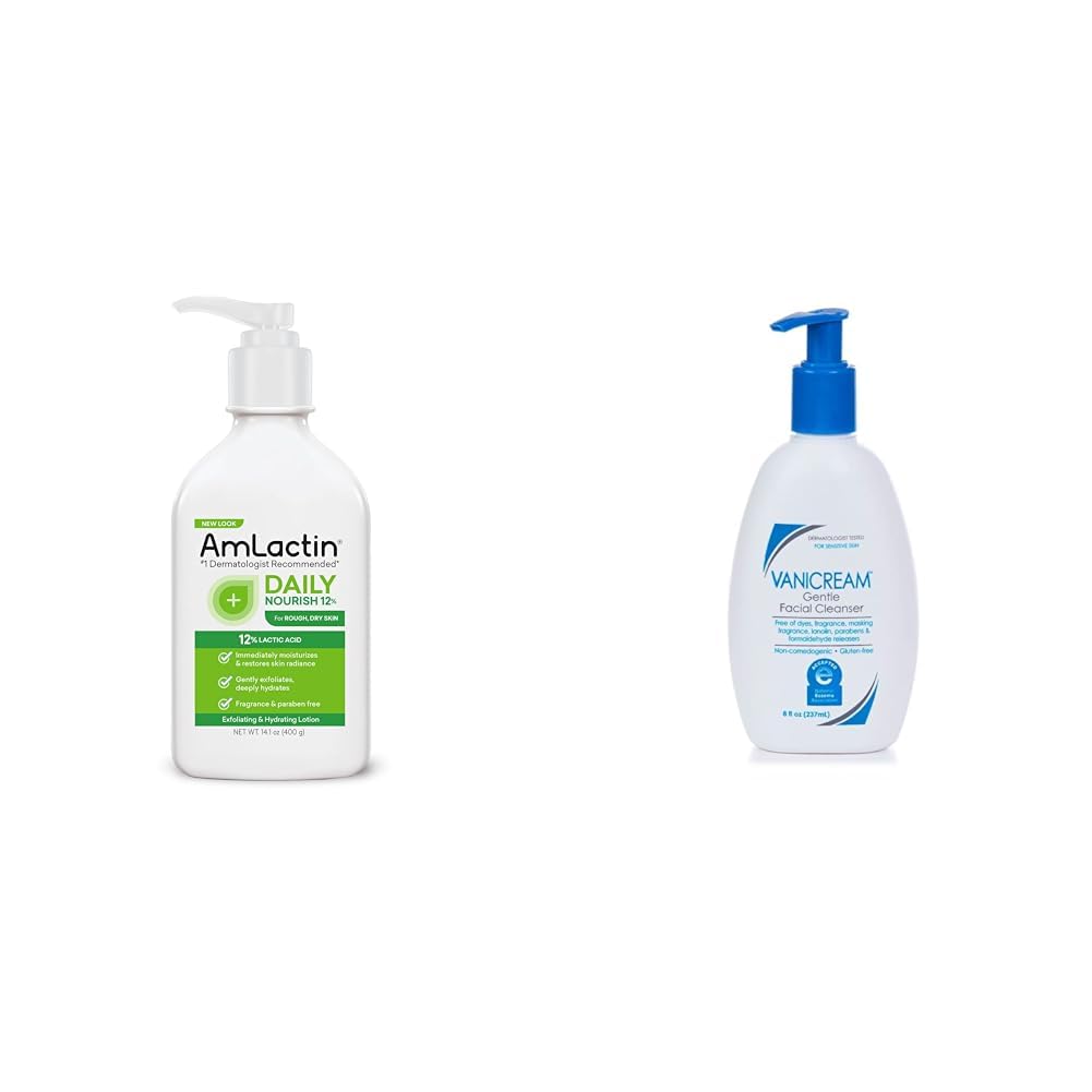The AmLactin Daily Nourish 12 - 14.1 oz Body Lotion and Vanicream Gentle Facial Cleanser 8 oz bundle is the perfect combination for comprehensive skin care. The AmLactin body lotion contains 12 lactic acid to gently exfoliate and deeply moisturize the skin. This fragrance-free, paraben-free lotion goes beyond basic moisture to smooth rough, dry skin and reveal radiant skin all over. It can be used as an all-in-one exfoliator and moisturizer. The Vanicream facial cleanser is specifically formulated for sensitive skin. It helps remove dirt, oil, and makeup without common irritants or harsh detergents that can dry out the skin. The gentle cleansing formula leaves skin feeling clean and soft. Together, these two products offer a simple yet complete routine. The AmLactin deeply hydrates while the Vanicream cleanser preps skin. Both are free of fragrances, parabens, sulfates and other irritants. And since both products avoid drying ingredients, using the gentle facial cleanser before the rich body lotion ensures comfortable, nourished skin. This bundle offers comprehensive skin care specially designed for sensitive, dry skin.
