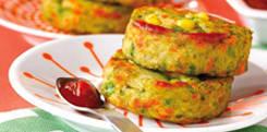 Des croquettes de poulet et de légumes faites maison, assaisonnées avec du bon ketchup Amora.