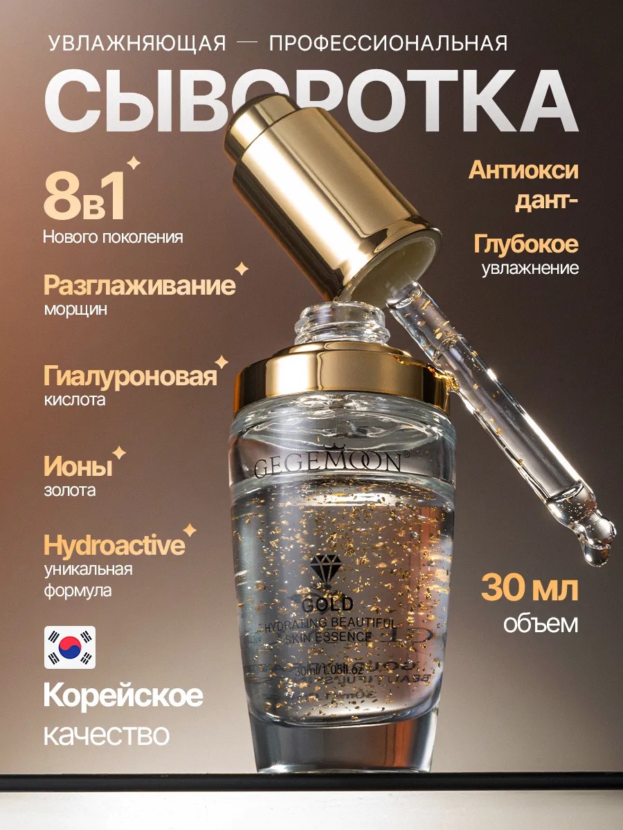 Питательная омолаживающая сыворотка с частицами золота, ретинолом и гиалуроновой кислотой для лица Gegemoon ANTI-AGE отличное решение в борьбе с возрастными проблемами, морщинами, шелушением кожи, сухостью. Идеально подойдет для всех типов кожи женщинам и девушкам, которые хотят выглядеть молодо, напитать свою кожу витаминами и сделать себя моложе. Омолаживающий продукт имеет в составе гиалуроновую кислоту, золото, мочевину, ретинол и ниацинамид. Борется с признаками старения, уменьшает проявления мимических и глубоких морщин. Выравнивает тон кожи и повышает ее защитные функции. Восстанавливает поврежденную ДНК. Гиалуроновая кислота предназначена для увлажнения, что поможет снизить количество и глубину морщин. Частицы золота лучшают микроциркуляцию кожи, ускоряют процесс обновления клеток, что очень важно для возрастной и увядающей кожи. Женская уходовая косметика с органическими составляющими обеспечивает идеальное увлажнение, восстановление и защиту. Она ухаживает за кожей, делая ее красивой и упругой. Чудодейственное средство premium качества борется с проблемами, выступает основой для макияжа и стимулятором омоложения. Питательный восстанавливающий комплекс незаменим для сухой, комбинированной и жирной кожи. Аптечная косметика идеальна для проблемной и чувствительной кожи, эффективна в устранении возрастных несовершенств. Дневной и ночной комплексный уход дает супер результат, дарит сияние и блеск. Можно просто и легко ухаживать за лицом во время путешествия. Интенсивный ежедневный уход подходит взрослым мужчинам и женщинам, перед которыми стоит задача подарить кожному покрову гладкость и красоту. Продукт, содержащий гидрогенизированное масло подходит для выравнивания, избавления от расширенных пор и высыпаний. Антивозрастную сыворотку наносят после умывания. Вокруг глаз наносить с осторожностью. Разработано по стандартам Кореи.