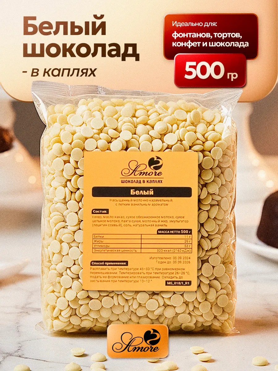 Amore Шоколад белый кондитерский в каплях 500г