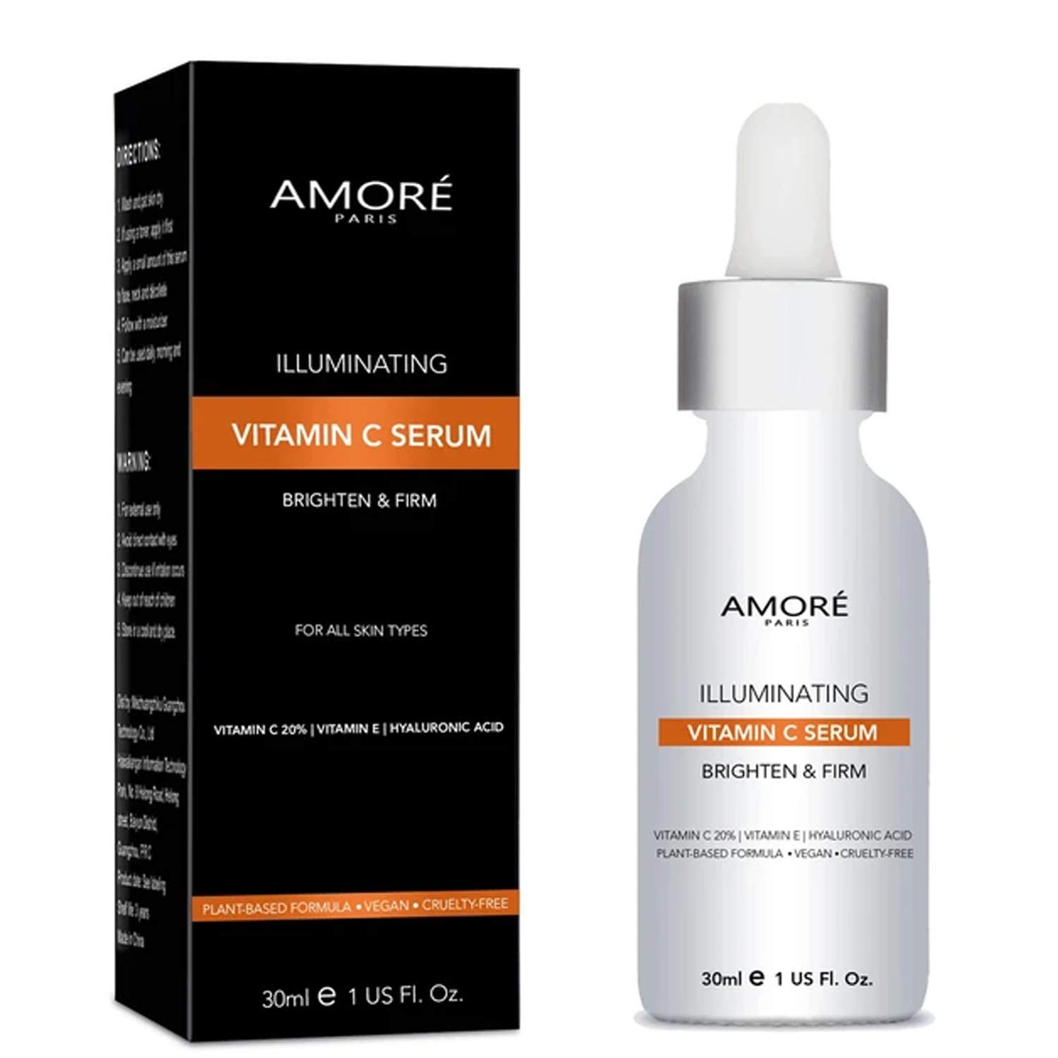 THE VITAMIN E SERUM that NOURISHES SKIN with SOOTHING MOISTUREIf you've tried other Vitamin C serums before, you may have experienced irritation, dryness, and flaking – problems caused by brands with harsh, unbalanced formulas.The Amore Paris Illuminating Vitamin C Serum is formulated differently, enhanced with ultra-hydrating Hyaluronic Acid and soothing Vitamin E that work together for a threefold effect:1) Our potent, 20 Percent Vitamin C concentration works to help prevent signs of aging 2) Meanwhile, Hyaluronic Acid helps to create a hydration barrier that helps lock moisture into the skin for powerful, continuous hydration.3) Finally, Vitamin E helps calm and protect skin from damageTHE POWER OF VITAMIN CMade with 20 Percent Vitamin C – the highest concentration advised for maximum skin absorption – this potent yet nourishing serum may help:Reduce visibility of fine linesFade sun spotsBrighten dull complexionsAid cell renewal - Protect against pollutantsPLANET-FRIENDLY FORMULAOur Vitamin C serum is a vegan, plant-based, zero-cruelty formula – for pure, gentle skincare that's kinder to the earth while protecting skin from harsh, damaging pollutants.PREMIUM SKINCARE YOU CAN TRUSTAt Amore Paris, we're committed to creating premium-quality wellness products for our customers – without the expensive markups. We use only the highest quality ingredients in our skincare products, for highly effective, premium-grade formulas.Unit count type: Fl Oz. At Amore Paris, we're committed to creating premium-quality wellness products for our customers – without the expensive markups. We use only the highest quality ingredients in our facial skin care products. If for any reason you aren't satisfied with your Vitamin C, Hyaluronic Acid and Vitamin E serum, please don't hesitate to reach out so we can make it right. Our customers are our top priority. Kinder to the earth: Our Vitamin C Hyaluronic Acid serum for face is a vegan, plant-based, zero-cruelty formula – for antiaging skincare products for women and men that are gentler on the planet while protecting skin from harsh, damaging pollutants. 3 skincare all-stars in 1 potent serum – What do you get when you combine Vitamin C, Hyaluronic Acid, and Vitamin E? An ultra-nourishing, skin-renewing serum that may have not only powerful anti-aging effects, but also protect against future damage, soothe redness and irritation, and infuse the skin with moisture for improved elasticity. While other Vitamin C facial serum brands often irritate skin, leaving it red and itchy, our Vit C serum for face is formulated to be gentler on the complexion, with Vitamin E to simultaneously soothe and strengthen the skin barrier. A hydrating ingredient, our Vitamin E helps fight off impurities to protect skin from damage – so it feels calm and protected. Unlike many Vitamin C serums that dry out the skin, causing it to flake and peel, the Amore Paris Illuminating Vitamin C Serum is "boosted" with Hyaluronic Acid, a hydration powerhouse with the ability to hold 1,000x its weight in water. By creating a hydration barrier that locks in moisture, Hyaluronic Acid can help to provide skin with continuous hydration – so Vitamin C can help repair skin while it's nourished.