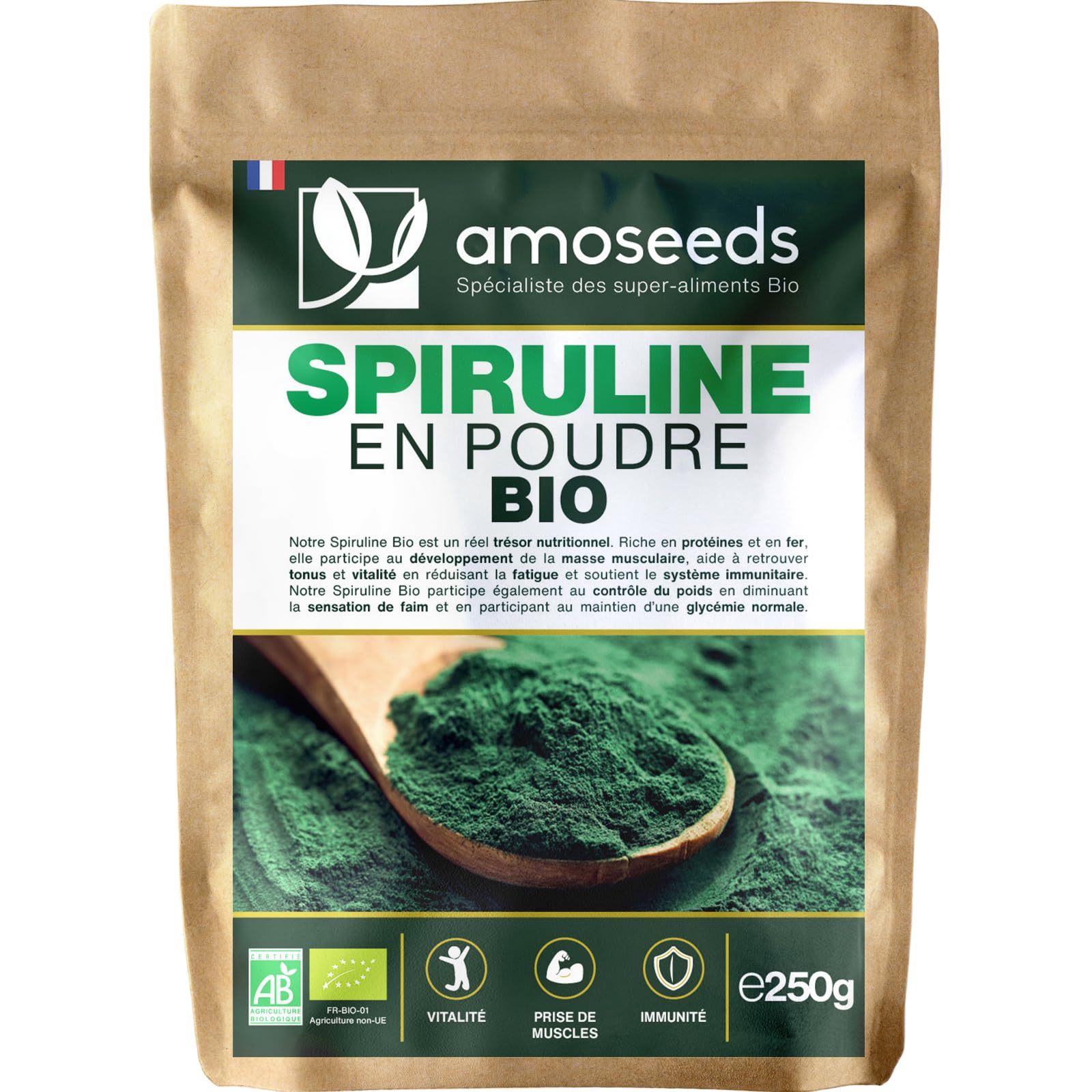 Highly valued by athletes, our Organic Spirulina is rich in protein, which aids recovery and contributes to muscle growth. A source of iron, this organic superfood also helps reduce fatigue, provides energy and vitality to the body, while ensuring proper muscle oxygenation. Our Organic Spirulina is also a valuable ally for those looking to better manage their weight, as it helps reduce appetite and hunger pangs, especially for sugary foods. Discover it in a powder format, easy to add to your drinks and highly absorbable! INSTRUCTIONS Store at room temperature, in a dry place, away from light. Suitable for children aged 6 and over. Not recommended for smokers. Without medical advice, this product is contraindicated for pregnant and breastfeeding women. Do not exceed the recommended daily dose. Consume as part of a healthy and balanced diet. INGREDIENTS 100 premium organic spirulina powder (Spirulina platensis (Gomont) Geitler). See more✓ CERTIFIED ORGANIC: 250g resealable and recyclable Kraft bag of Amoseeds Premium Organic Spirulina powder. 100 pure, vegan, additive-free, preservative-free, GMO-free, pesticide-free, artificial color-free, gluten-free, and lactose-free. Each batch is third-party tested to ensure its quality and purity. Packaged in France. ✓ SUPERIOR QUALITY, HIGH ABSORPTION: Thanks to its 100 pure powder format, easy to use and highly absorbable, our Organic Spirulina is ideal for enjoying the many benefits of this superfood, regardless of your diet (vegetarian, vegan, etc.). You can incorporate it into your sweet recipes (smoothies, juices, etc.) or add a touch of originality to your savory dishes (soup, guacamole, salad, etc.). ✓ MUSCLE RECOVERY, SPORT: Organic Spirulina is the ideal ally to help you maintain good physical performance while improving your recovery. Thanks to its high iron and protein content, it contributes to proper muscle oxygenation and helps reduce fatigue during training, while also helping to rebuild muscle fibers damaged after a workout. ✓ WEIGHT CONTROL: Scientifically recognized for its beneficial effects on weight control, our Organic Spirulina helps reduce hunger and appetite. It is particularly recommended to help better manage food intake and daily snacking. Furthermore, thanks to its ability to limit the digestion and absorption of carbohydrates, our Organic Spirulina contributes to normal blood sugar levels. ✓ HELPS REDUCE FATIGUE, BOOSTS IMMUNITY: Our Organic Spirulina is highly valued for its high iron content, a mineral that helps reduce fatigue and supports daily immunity. Consumed daily, it helps revitalize the body and maintain optimal health. This supplement is ideal if you experience low energy, temporary fatigue, or simply want to boost your vitality!Spiruline en poudre BIO 250G Naturelle et Pure Riche en protéines, fer Énergie, Sport, Immunité Sans OGM, sans Conservateurs Qualité SupérieureDESCRIPTION DU PRODUIT DESCRIPTION DU PRODUIT Très appréciée par les sportifs, notre Spiruline Bio est riche en protéines qui participent à la récupération en contribuant au développement de la masse musculaire. Source de fer, ce super-aliment Bio aide également à réduire la fatigue, apporte énergie et vitalité à l'organisme, tout en assurant la bonne oxygénation des muscles. Notre Spiruline Bio est également un allié pour les personnes qui souhaitent mieux contrôler leur poids puisqu'elle contribue à réduire l'appétit et la sensation de faim, notamment pour les aliments sucrés. Découvrez-la sous un format poudre, facile à intégrer dans vos boissons et hautement absorbable ! INDICATIONS À conserver à température ambiante, au sec et à l'abri de la lumière. Consommation autorisée à partir de 6 ans. Déconseillée aux fumeurs. Sans avis médical, ce produit est contre-indiqué aux femmes enceintes et allaitantes. Ne pas dépasser la dose journalière conseillée. À consommer dans le cadre d'une alimentation saine et équilibrée. INGRÉDIENTS 100 de spiruline (Spirulina platensis (Gomont) Geitler) en poudre biologique de qualité supérieure. Voir plus✓ CERTIFIÉE BIOLOGIQUE : sachet Kraft refermable et recyclable de 250g poudre de Spiruline Biologique de Qualité Supérieure Amoseeds. Produit 100 pur, vegan, sans additif, sans conservateur, sans OGM, sans pesticides, sans colorant artificiel, sans gluten et sans lactose. Chaque lot est testé par des tiers afin de s'assurer de leur qualité et leur pureté. Produit conditionné en France. ✓ QUALITÉ SUPÉRIEURE, HAUTE ABSORPTION : grâce à son format poudre 100 pure, facile à utiliser et hautement absorbable, notre Spiruline Bio est idéale pour profiter des multiples bienfaits de ce super-aliment, peu importe votre régime alimentaire (végétarien, végétalien…). Vous pourrez ainsi l'intégrer dans vos recettes sucrées (smoothies, jus…) ou apporter une touche d'originalité à vos plats salés (soupe, guacamole, salade…). ✓ RÉCUPÉRATION MUSCULAIRE, SPORT : la Spiruline Bio est l'alliée idéale pour vous aider à conserver de bonnes performances physiques, tout en améliorant votre récupération. En effet, grâce à sa richesse en fer et protéines, elle participe à la bonne oxygénation des muscles et aide à réduire la fatigue pendant l'entraînement, tout en contribuant à la reconstruction des fibres musculaires lésées suite à une séance de sport. ✓ CONTRÔLE DU POIDS : scientifiquement reconnue pour son action bénéfique sur le contrôle du poids, notre Spiruline Bio aide à réduire la faim et l'appétit. Elle est notamment conseillée pour aider à mieux gérer les prises alimentaires ainsi que les grignotages quotidiens. De plus, grâce à sa capacité à limiter la digestion et l'absorption des glucides, notre Spiruline Bio contribue à un taux de sucre normal dans le sang. ✓ AIDE À RÉDUIRE LA FATIGUE, IMMUNITÉ : notre Spiruline Bio est très appréciée pour sa grande richesse en fer, un minéral qui con