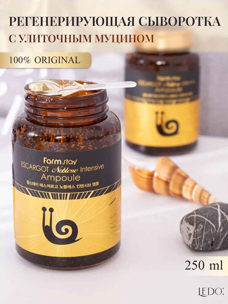 Многофункциональная ампульная сыворотка с муцином улитки Escargot Noblesse Intensive Ampoule от корейского бренда FARMSTAY для глубокого восстановления и увлажнения кожи ускоряет процессы обновления и регенерации; устраняет красноту и воспаления; способствует разглаживанию морщин и повышает упругость кожи; увлажняет и восполняет недостаток влаги в клетках эпидермиса.