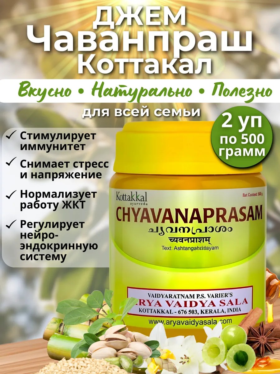 Индийский аюрведический джем Коттаккал- проверенное временем средство для заботы о своем здоровье. Чаванпраш kottakkal обладает комплексным и сильным эффектом, являясь мощным антиоксидантом. Имеет множество показаний, начиная от укрепления иммунитета, заканчивая легким успокаивающим действием. При постоянном употреблении повышает устойчивость к ОРВИ и другим вирусам. В его составе только натуральные компоненты, более 40 наименований, среди которых: коренья, орехи, плоды и ягоды, лекарственные травы, мед, минералы, витамины, микроэлементы, растительные масла. Он обладает легким солоноватым послевкусием и варится на качественном топленом масле гхи. В его составе есть басмы (пеплы) минералов, драгоценных камней, серебра и золота и сбор редких трав, насыщающих организм нужными ему минералами. Такой лечебный, витаминный суперфуд предотвращает выпадение и способствует росту волос, улучшает пищеварение, нормализует уровень сахара в крови, а также снижает уровень плохого холестерина. Это варенье - натуральный энергетик и может сработать как натуральный антидепрессант. Благодаря ему уйдет усталость и апатия, улучшится настроение, появится энергия. Травяной гель положительно влияет на работу почек, сердечно-сосудистой системы, укрепляя стенки сосудов. В умеренном количестве можно употреблять будучи на диете, пп или тем кто за здоровое питание. Такое полезное пюре в банке положительно влияет на репродуктивные функции мужчин и женщин. Показано не только для мужского или женского здоровья, но еще подходит для подростков и детей от 3 лет. Поливитамины и молотые травы в составе пюре способствуют нормализации сна при бессоннице и могут сработать как легкое успокоительное для парней и women. Съедобное полезное средство можно употреблять как варенье, добавляя в чай, молоко или намазывая на хлеб/хлебцы и на любую похожую еду. Благодаря положительному влиянию продукта на кишечник, подойдет тем, у кого есть склонность к набору веса. При употреблении натурального и полезного джема вы меньше будете хотеть вредные сладости, что повлияет на снижение веса, то есть похудение, и поможет похудеть. Минеральный фиточай для оздоровления заменит вам привычные лекарства и бады. Правильное питание и аюрведа напиток улучшат внешний вид кожи лица. Эта универсальная добавка из трав - отличный способ позаботиться о здоровье своих близких. В нашем магазине вы можете приобрести не только товары для дома или препараты для восстановления иммунитета, но и полезные подарки или дополнения в подарочный набор.