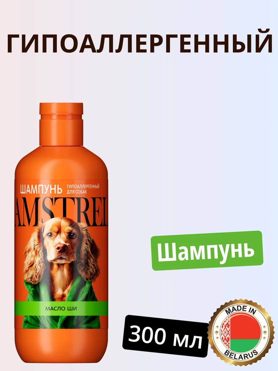 Belarusian Amstrel Shampoo is a product for regular grooming of dogs and puppies. Amstrel organic dog shampoo contains Shea butter, which moisturizes dry puppy skin, adds shine, and improves the coat quality of short- and long-haired breeds, including Spitz, Terriers, Pugs, Corgis, Beagles, Poodles, and Maltese. This pet shampoo has excellent cleaning properties and rinses easily. It is non-irritating and non-greasy, cares for your pet's coat without causing allergies or irritation, and leaves a pleasant scent.