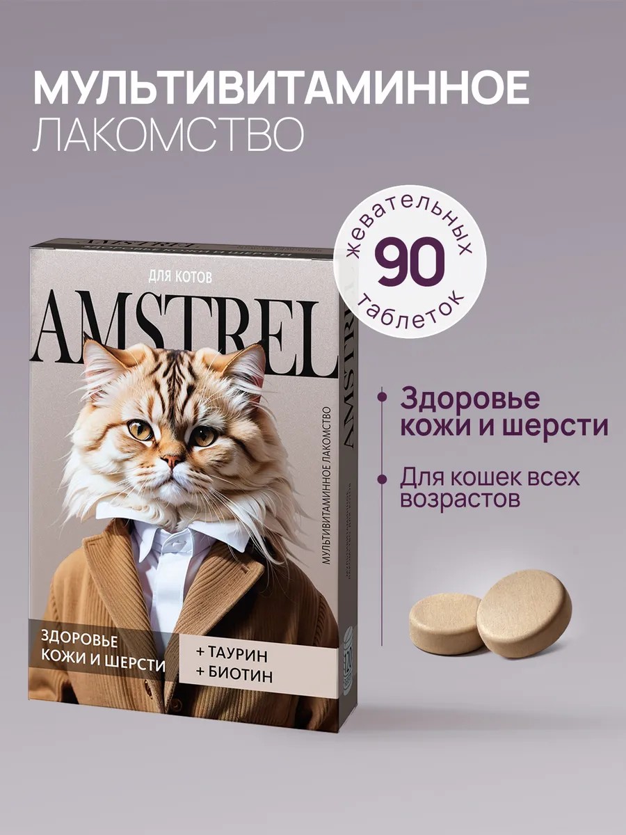AMSTREL Мультивитамины для кошек Здоровье кожи и шерсти 90 таблеток