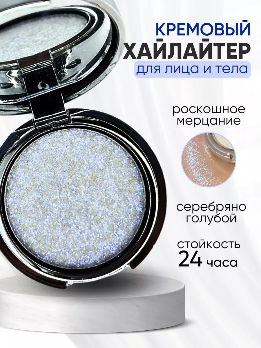 Хайлайтер для лица и тела с серебристо-голубым оттенком - для тех, кто хочет добавить в свой образ нотку роскошного сияния и блеска. Благодаря его легкой кремово-пудровой текстуре продукт легко наносится и растушевывается, обеспечивая равномерное покрытие. Вы сможете подчеркнуть ключевые зоны скул, глаз, губ и декольте. Главное преимущество это стойкость 24 часа. С ним Вы всегда будете в центре внимания, прекрасны и уверены в себе!