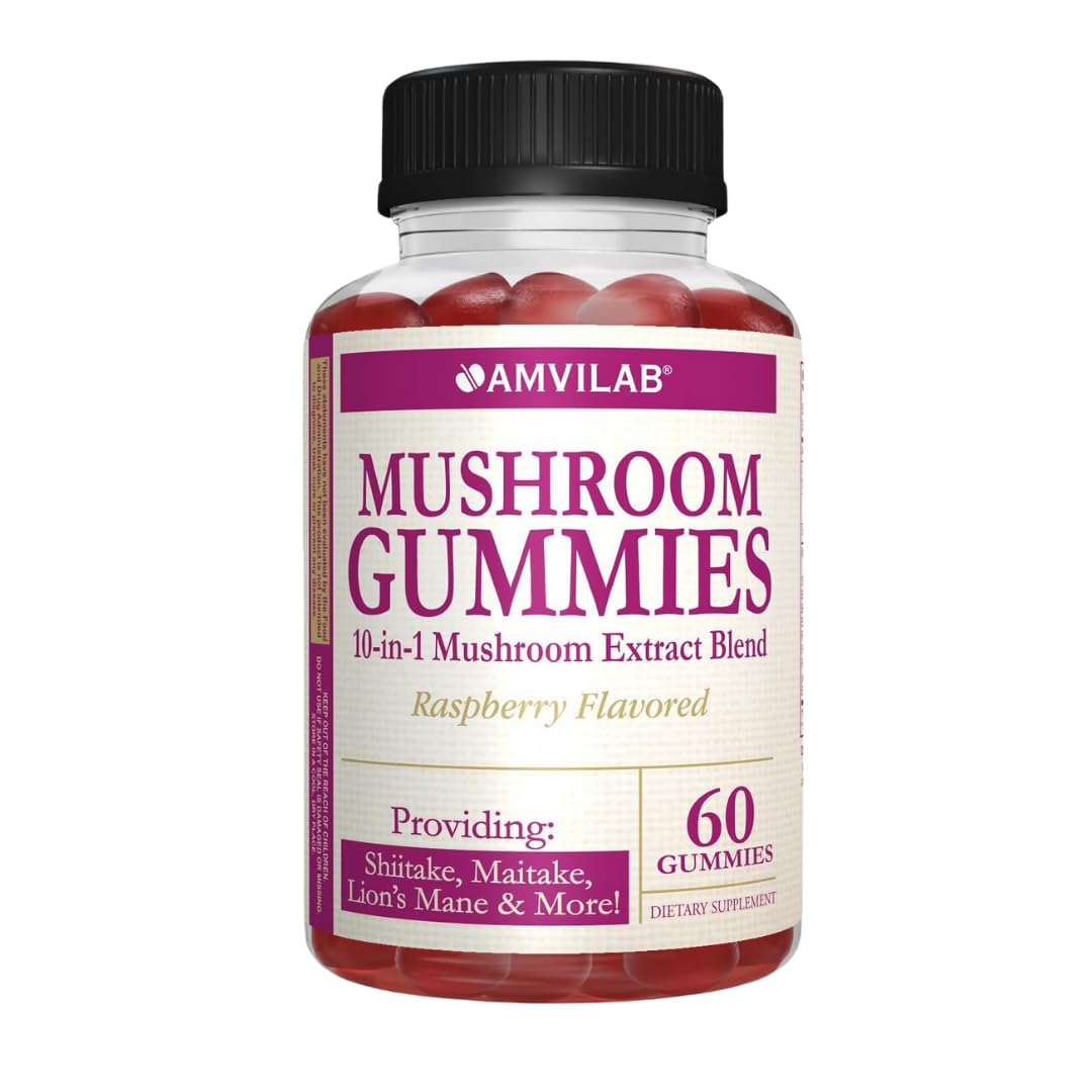 AMVILAB - We're AMVILAB, your trusted ally on the road to peak wellness. With expertise at our core, we pick the finest ingredients and rigorously test them, ensuring they address the unique wellness challenges of modern life. Choose AMVILAB, loved by people, trusted for quality. PREMIUM QUALITY - At AMVILAB, we never compromise when it comes to the quality of the supplement. Our Mushroom Gummies are gluten free, non-GMO, GMP-certified and made in the USA. Take 2 gummies daily to harness the benefits of this supplement. DELICIOUS GUMMIES - Enjoy the benefits of the mushroom extracts in a delicious, easy-to-consume raspberry-flavored gummy form. Made with natural ingredients, no artificial flavors or colors, you can feel confident about the ingredients in our Mushroom Gummies. MUSHROOM BENEFITS - Fortify your body's defenses with mushrooms known for their immune-boosting properties. Ingredients like Cordyceps and Maitake are known for their potential to boost energy levels and vitality. Reishi and Chaga may help your body respond better to stress and Lion's Mane may help support memory, focus, and nerve health. COMPREHENSIVE WELLNESS - Our Mushroom Gummies are formulated to support overall wellness, including immune health, cognitive function and vitality. With a 10-in-1 mushroom extract blend, this supplement provides the benefits of Shiitake, Maitake, Lion's Mane and more.