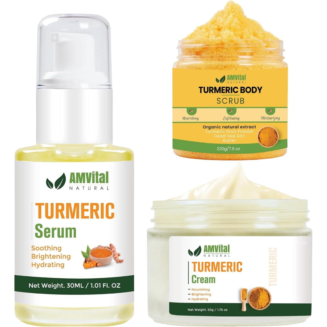 AMVital Turmeric Skincare Set - Scrub Serum Cream - Handcrafted All-Natural - Suitable for All Skin Types