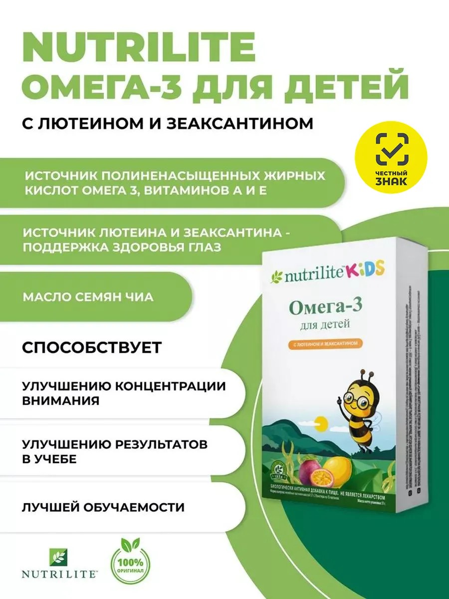 Для здоровья и развития вашего ребенка предлагаем жевательные БАДы Amway США. В составе - омега 3 из норвежского рыбьего жира ( Эйкозапентаеновая и Докозагексаеновая кислота ) , а также D3, E, лютеин из аквадетрима и аскорбилпальмитата. Каждая капсула содержит необходимые для роста и развития детей вещества, такие как кальций, хром пиколинат и альфа-липоевая кислота. БАДы Nutrilite в блистерах отлично подойдут для детей от 2 до 6 лет. Помогут укрепить иммунную систему, улучшить пищеварение и обеспечить правильное функционирование организма. Не содержат слабительных и искусственных добавок. Попробуйте и вы оцените эффективность и качество норвежских БАДов от Амвэй. Амвей нутрилайт детский амега покупайте на wildberries