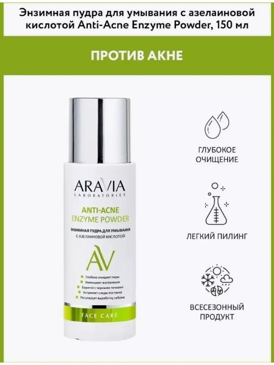 This enzyme powder is designed for oily and problematic skin prone to acne. Upon contact with water, the powder transforms into a soft foam, gently and effectively cleansing pores without drying them out. Azelaic acid provides antibacterial, anti-inflammatory, and sebum-regulating properties. It combats acne at all stages of development, reduces inflammation and blackheads, and eliminates post-acne scars. Papaya enzymes exfoliate dead skin cells, dissolve protein impurities, eliminate flaking, and reduce comedones. Blue clay effectively combats acne, lightens age spots, evens out skin tone, and removes excess sebum. Oat extract soothes and softens the skin. The powder enhances the effect of subsequent care, evens out the skin's microrelief, and leaves skin feeling smooth and velvety. ACTION: Deeply cleanses pores Reduces inflammation Fights blackheads Eliminates traces of acne Regulates sebum production Exfoliates.