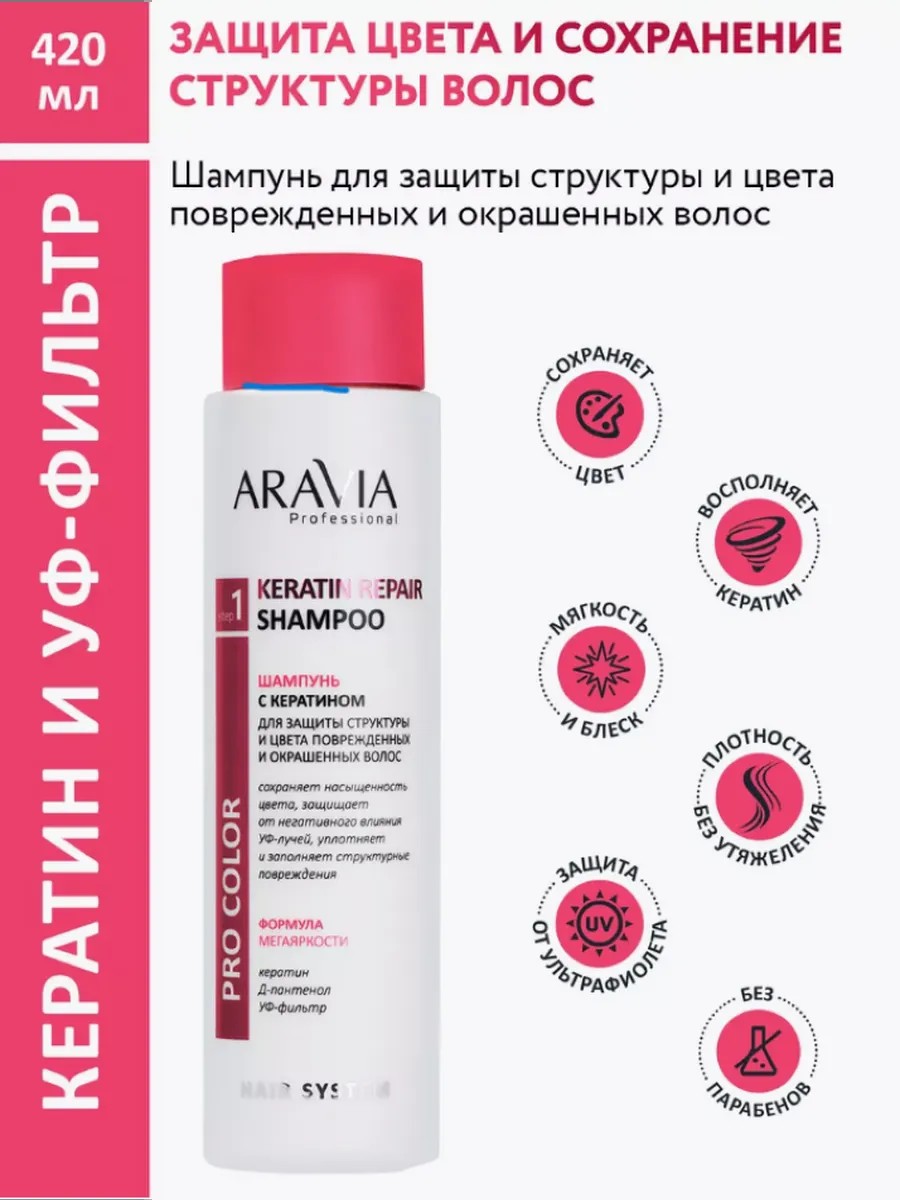 Aravia shampoo's rich keratin formula gently cleanses, actively restores damaged hair, and protects color after coloring. A natural building block of hair, the keratin molecule successfully integrates into its deep layers, significantly increasing density and resistance to damage and external irritants. Aravia shampoo strengthens the hair fiber, helps prolong the effect of the coloring procedure, maintaining maximum color intensity for a long time and preventing it from fading. D-panthenol smoothes the cuticle and saturates lifeless strands with moisture, facilitating styling and making hair manageable. A UV filter in the shampoo prevents UV rays from destroying the lipid layer, providing protection to weakened, damaged hair, restoring its softness, silkiness, and shine. Prevents color fading and protects against fading. natural strands. Do not use during the first week after the coloring procedure.