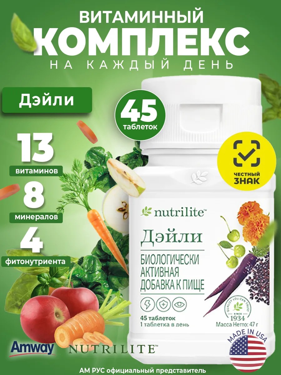 Витамины на каждый день Дейли от Нутрилайт — единственный в мире бренд витаминных и минеральных комплексов на растительной основе, большую часть растительных ингредиентов для которых выращивают, собирают и перерабатывают на собственных сертифицированных органических фермах. Комплекс не содержит искусственные вкусовые добавки, красители и консерванты. В новой улучшенной формуле витаминов амвей повышена эффективность действия, увеличена дозировка важных элементов, усилена поддержка иммунитета, уровня энергии и здоровья глаз, а так же более мягкое воздействие на желудок. Витамины Дэйли для здоровья и красоты содержат 13 витаминов (Витамин A, витамин c, витамин Д, витамин Е, витамины группы В - B1, B2, B3, B6, фолиевую кислоту, B12, биотин, пантотеновую кислоту, бета-каротин), 8 минералов (кальций, железо, йод, магний, цинк, медь, селен, марганец, лецитин), а так же 4 фитонутриента (экстракт бузины, пурпурная морковь, вишня ацерола, лютеин). Эти бады ежедневно обеспечивают организм широким набором питательных веществ в сбалансированном виде, являются витамины для волос, Витамины A, C, D, B6, фолиевая кислота, B12, железо, цинк, медь, селен поддерживают иммунную функцию. Витамины С, В1, В2, В3, В6, биотин, пантотеновая кислота, магний, йод, железо, цинк, медь, марганец положительно влияют на энергетический обмен. Витамин А, рибофлавин В2, цинк не заменимы для здоровья глаз. Фитонутриенты комплекса: экстракт бузины, пурпурная морковь, вишня ацерола и лютеин – это мощная защита от оксидативного стресса. Они улучшают работу иммунной системы, препятствуют окислению липопротеидов в крови, противостоят неблагоприятному воздействию солнечных лучей поддерживают молодость кожи лица и тела, способствуют похудению , росту волос, укреплению ногтей, усиливают действие витаминов. Витамины американского производителя содержат базовое количество основных витаминов и минералов для женщин и мужчин, позволяя Вам быть уверенными в том, что Вы заботитесь о себе, как следует. В новом формате витаминов в продукцию amway Дэйли добавлен лютейн, который благоприятно воздействует на организм и восстанавливает зрение. Взрослым по 1 таблетке в день во время приема пищи. Продолжительность приема – 1 месяц. При необходимости курс можно повторить.