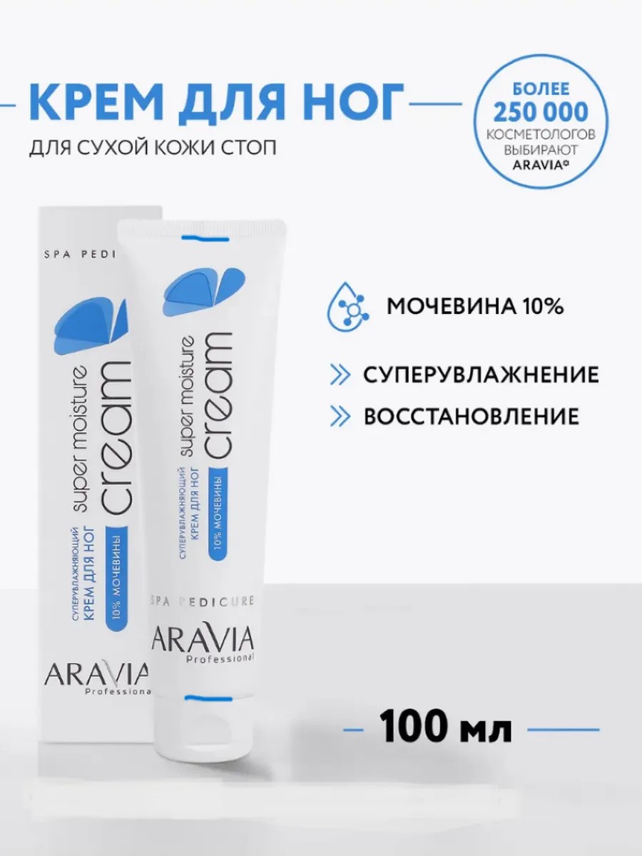 Суперувлажняющий крем для очень сухой кожи стоп. Решает проблемы загрубевшей кожи и гиперкератоза. Мочевина (10%) - эффективно смягчает кожу стоп, оказывает длительное увлажняющее воздействие, предотвращая появление натоптышей и трещин. Аллантоин - успокаивает, восстанавливает мягкость и эластичность кожи, способствует её регенерации. Комплекс жирных масел авокадо, подсолнечника и кокоса - восстанавливает защитный липидный барьер, препятствует потере влаги и появлению сухости. Продукт для профессионального применения!