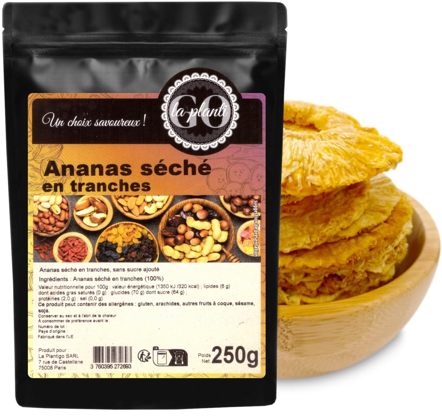 Ingredients: Dried sliced pineapple, no added sugar (100 ) Nutritional values per 100g: Energy – 1350 kJ 320 kcal Fat – 6g of which saturates – 0g Carbohydrate – 70g of which sugars – 64g Protein – 2g Salt – 0g Nutritional values were calculated from raw material databases and specifications. Individual batches may vary slightly. Allergen Information: This product may contain the following allergens: gluten, peanuts, tree nuts, sesame, soy. Packaging Method: The product is packaged in thick, doypack-type pouches. The packaging has a heat-sealed drawstring closure, allowing for easy opening and resealing multiple times. Thanks to this simple technology, the product retains its freshness. Its organoleptic properties remain unchanged throughout its shelf life. Thanks to high sales volumes and our stock turnover, LA PLANTIGO products are always fresh, making them ideal for bulk purchases and stocking up on food in your home pantry. Ingredients: Dried sliced pineapple, no added sugar (100 )It can also be used to enhance your homemade lemonades or cocktails, or to flavor your teas. You can also add it to meat dishes, especially roast chicken or pork loin. It's also suitable for rice dishes with Asian-style vegetables. For savory dishes, it pairs perfectly with Asian cuisine, such as curry. It's a healthy and flavorful alternative to sweets. Ideal in dried fruit mixes with, among other things, nuts or almonds. Sliced dried pineapple is a naturally sweet and aromatic product that can be used in many recipes.Description du produit Ingrédients : Ananas séché en tranches, sans sucre ajouté (100 ) Valeurs nutritionnelles pour 100 g : Valeur énergétique – 1350 kJ 320 kcal Lipides – 6 g Dont acides gras saturés - 0 g Glucides – 70 g Dont sucres - 64 g Protéines – 2 g Sel – 0 g Les valeurs nutritionnelles ont été calculées à partir de base de données et spécifications de matières premières. Les lots individuels peuvent varier légèrement. Information sur allergènes : Ce produit peut contenir les allergènes : gluten, arachides, fruit à coque, sésame, soja. Méthode d'emballage : Le produit est emballé dans des sachets épais de type « doypack ». L'emballage a une fermeture à cordon soudé, ce qui permet l'ouverture et la fermeture facile plusieurs fois. Grâce à cette technologie simple le produit garde sa fraicheur. Ses propriétés organoleptiques ne changent pas pendant toute la durée de conservation. Grâce aux volumes de ventes important et la rotation de nos stocks, les produits LA PLANTIGO sont toujours frais, ce qui favorise les achats en gros et le stockage des aliments dans le garde-manger à la maison. Ingrédients Ananas séché en tranches, sans sucre ajouté (100 )Il peut aussi être utilisé pour enrichir vos limonades ou cocktails maison, ou bien aromatiser vos thés. Vous pouvez également l'ajouter aux plats de viande, notamment au poulet rôti ou à la longe de porc.Il convient aussi aux préparations à base de riz avec des légumes à l'orientale. Pour ce qui est des plats salés, il se marie parfaitement avec les mets de cuisine asiatique, par exemple le curry. C'est une alternative saine et savoureuse aux sucreries. Idéal dans les mélanges de fruits secs avec, entre autres, des noix ou des amandes. L'ananas séché en tranches est un produit naturellement sucré et aromatique qui peut faire partie de nombreuses recettes.Ananas séché en tranches, sans sucre ajouté 250 g - LA PLANTIGO