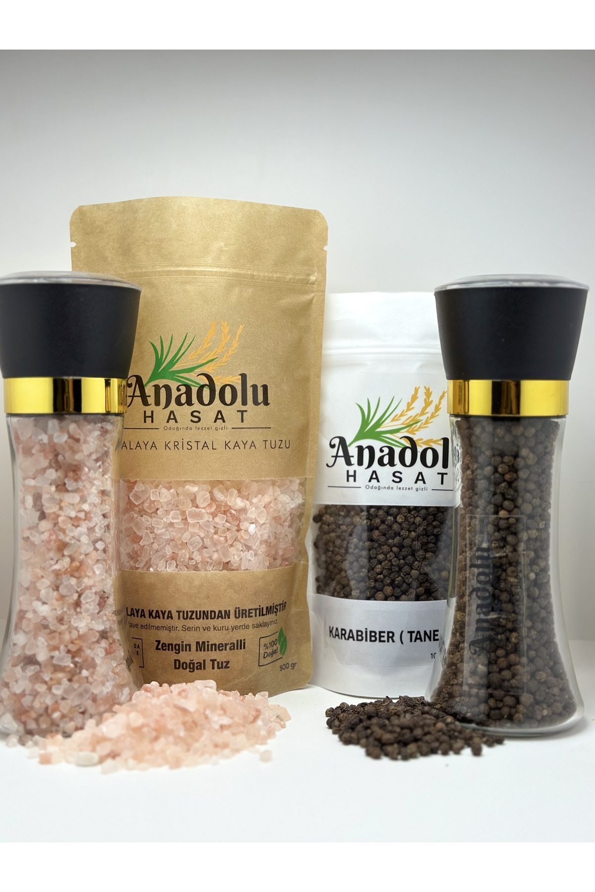 ANATOLIAN HARVEST 4-PIECE SET - HIMALAYAN TABLE GRINDING ROCK SALT 500GR + 100 GR BLACK PEPPER + 2PCS 200GR MILL