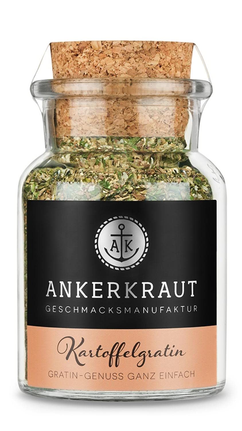 Do you first think of pasta or potatoes with a cheese baked casserole?If you now ""clearly potatoes!""called, then you are exactly right here.With our fabulous gratin spice, the slices cut into slices succeed effortlessly and without a long taste.No salt, no re -seasoning - with this mix of onion, thyme, nutmeg & Co. your potato casserole with cream sauce is guaranteed to be a pleasure guarantee for the whole family.A pinch of garlic and pepper in the preparation of the spice ensures the right pep in gratin.You can't just make fries out of potatoes so that it gets super delicious! Ingredients / ingredients Sea salt, onion, thyme, parsley, majoran, garlic, nutmeg, black pepper Instructions 2 TL for 200 g of cream Address manufacturer/importer Ankerkraut GmbH, Tempowerkring 6, 21079 Hamburg More [gift idea] Our potato gratin spice not only convinces taste, but is an absolute eye-catcher in every kitchen in the elegant cork glass.Just give away something nice, give away love, give away anchor herb!.[Recipe] Cut the potatoes and ingredients of your choice into slices and place them in the form that is brushed with butter.Use about two teaspoons for 200 g of cream.Cheese over it and off in the oven!.[Best Quality] The ingredients are freshly covered and filled into the classic cork glasses.The flavor enhancers, additives and sugar are dispensed with.[Fits] The name is the program: Choke your potato gratin with this delicious spice mixture.Schnitzel, meatball or liver cheese and your dish is ready!.[Taste] With this mix of garlic, thyme and onion you have the perfect mix for your next potato gratin!. Denkst du bei einem mit Käse überbackenen Auflauf zuerst an Nudeln oder Kartoffeln? Wenn du jetzt ""Ganz klar Kartoffeln!"" gerufen hast, dann bist du hier genau richtig. Mit unserem fabelhaften Gratin-Gewürz gelingen die in Scheiben geschnittenen Erdäpfel aus dem Ofen mühelos und ohne langes Abschmecken. Kein Versalzen, kein Nachwürzen - mit diesem Mix aus Zwiebel, Thymian, Muskatnuss & Co. wird dein kartoffeliger Auflauf mit Sahnesoße garantiert ein Genuss-Garant für die ganze Familie. Eine Prise Knoblauch und Pfeffer in der Gewürzzubereitung sorgt für den richtigen Pepp im Gratin. Aus Kartoffeln kann man eben doch nicht nur Pommes machen, damit es super köstlich wird! INHALTSSTOFFE / ZUTATEN Meersalz, Zwiebel, Thymian, Petersilie, Majoran, Knoblauch, Muskatnuss, schwarzer Pfeffer GEBRAUCHSANWEISUNG 2 TL für 200 g Sahne ANSCHRIFT HERSTELLER/IMPORTEUR Ankerkraut GmbH, Tempowerkring 6, 21079 Hamburg Mehr[GESCHENK-IDEE] Unser Kartoffelgratin Gewürz überzeugt nicht nur geschmacklich, sondern ist im eleganten Korkenglas ein absoluter Hingucker in jeder Küche. Verschenke einfach etwas Schönes, verschenke Liebe, verschenke Ankerkraut!. [REZEPT] Kartoffeln und Zutaten deiner Wahl in Scheiben schneiden und in die mit Butter bepinselte Auflauf Form geben. Ungefähr zwei Teelöffel für 200 g Sahne verwenden. Käse darüber und ab in den Backofen!. [BESTE QUALITÄT] Die Zutaten werden frisch bezogen und in die klassischen Korkengläser abgefüllt. Dabei wird auf Geschmacksverstärker, Zusatzstoffe und Zucker verzichtet. [PASST ZU] Der Name ist Programm: Würze kinderleicht deinen Kartoffelgratin mit dieser leckeren Gewürz Mischung. Schnitzel, Frikadelle oder Leberkäse dazu und fertig ist dein Gericht!. [GESCHMACK] Mit diesem Mix aus Knoblauch, Thymian und Zwiebel hast du die perfekte Mischung für deinen nächsten Kartoffelgratin parat!.Ankerkraut Kartoffelgratin Gewürz, Auflauf mit Kartoffeln kochen, Gratin mit Käse überbacken im Backofen, leckere Zutaten für Gemüse, einfach zu Hause selber machen, 80 g im Korkenglas