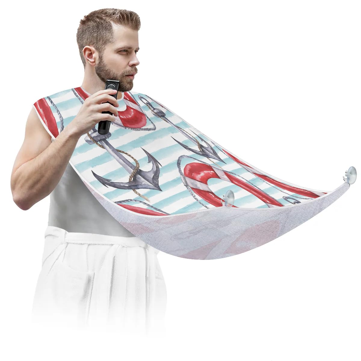 fiber fabric, ensuring exceptional quality. The fabric has a smooth and soft surface that is not sticky to hair, making it comfortable to wear during grooming sessions. It is also waterproof and anti-static, further enhancing its practicality. In addition, it is equipped with two high-quality suction hooks that provide powerful suction without leaving marks on mirrors or tiles. ?Convenient and Easy to Use?: Using our beard hair catcher is a breeze. Just fasten it around your neck using the adjustable strap and secure it to the mirror. Once in place, you can effortlessly proceed with your regular grooming routine. When you're done, simply remove the beard bib from the suction cups. Then brush the collected hair into the trash can for easy cleanup. ?Effortless Hair Cleanup?: Our Anchor Lifebuoy Pattern beard bib is expertly designed to capture all loose beard hair, mustache, and sideburn trimmings, providing effortless cleanup and keeping your sink immaculately clean. This saves you valuable time that would otherwise be spent on tedious cleaning tasks. Not only does it serve a practical function, but it also adds a stylish touch to your daily grooming routine.