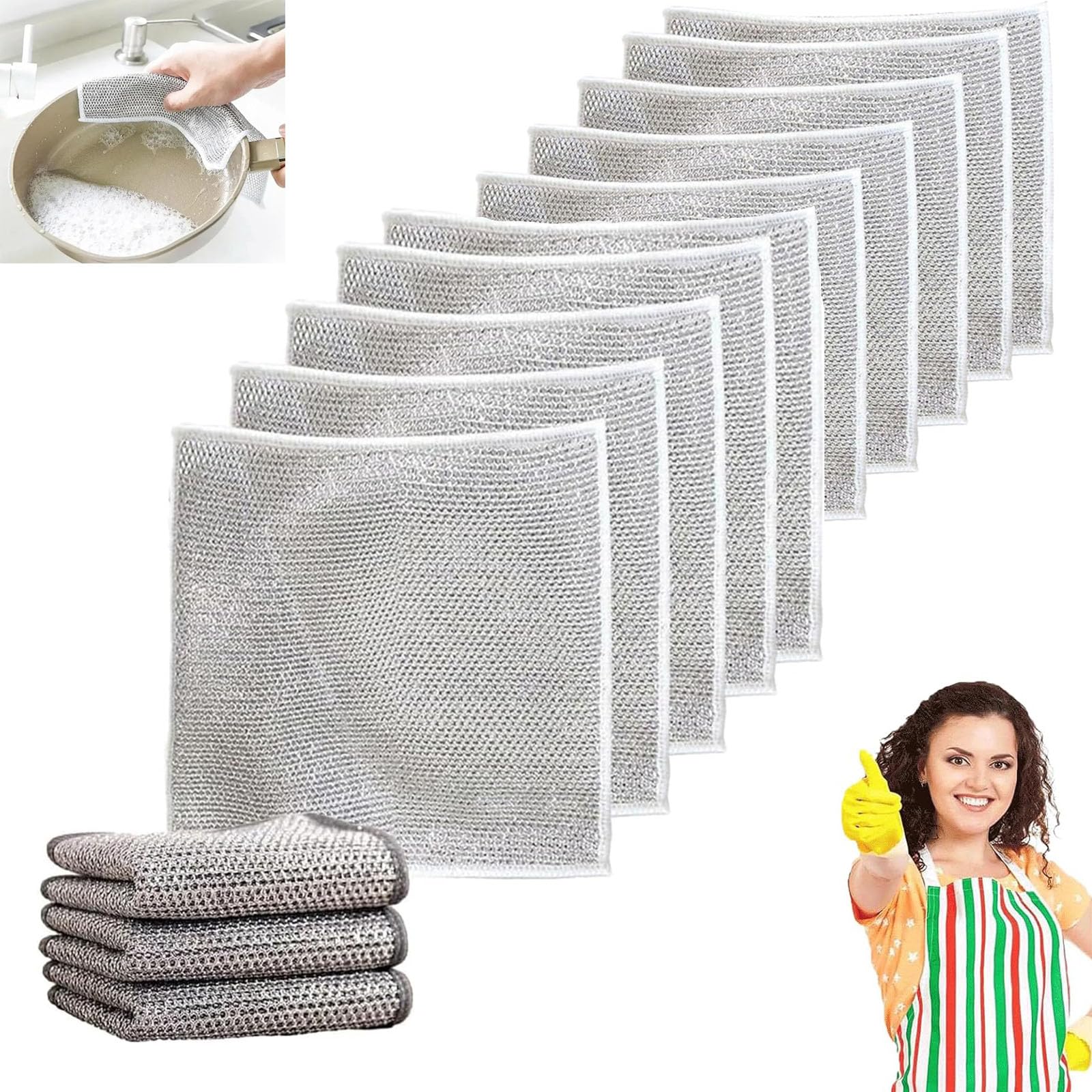 Ancienflow Scrubber,Ancienflow Double Stainless Steel Scrubber,Double Sided Silver Wire Dishcloth,Grey Non-Scratch Scrubbing Wire Dishwashing Rags , Double Stainless Steel Scrubber Cloth Feature: 1. Powerful Cleaning Effect 2. Wet and Dry Use 3. Can Be Used Repeatedly 4. Suitable for Many Situations Specification: 100 Brand new and high quality Product Name: Multipurpose Wire Dishwashing Rags for Wet and Dry Size: 20 X 20 Cm (7.87 X 7.87 Inches) Colors: Silver Material: Metal Uses: Remove stains, clean mess, polish glass, dry dishes - or just about anything inside or outside your home! Package Inculdes: 5 8 10 Pcs Multipurpose Non-Scratch Scrubbing Wire Dishwashing Rags Notes: 1. Please allow slight dimens error due to manual measurement. Thank you for your understanding! 2. Due to different monitors and different lighting, the picture may not show the actual color of the item. Thank you for your understanding. About Service: If you have any questions about our products, please send us your questions directly, we will always be online to answer you.?Widely Used?: Multi-purpose wire dishwashing rag, can be used to wipe kitchenware, cars, electronics, household appliances, furniture, etc. Meet your various needs. ?Easy to Clean and Use?: The wire dishcloth can be rinsed directly with water. It can be used over and over again without losing shape or effectiveness. ?Multipurpose Wire Cleaning Cloths?Efficient cleaning power Clean mess, polish glass, dry dishes - or just about anything inside or outside your home! Say goodbye to messy. Do not injure the hands, easy to clean. ?Absorbent Quick Dry?: Thanks To The Design Of Its Fish-Scale Lattice Fabric Surface, It Can Absorb Moisture Instantly. It Dries Quickly And Is Easy To Clean.The Wire Dishwashing Rag Can Be Rinsed Directly With Water. It'S Built To Be Used Over And Over Without Deteriorating Or Losing Effectiveness. ?Powerful Cleaning?Ancientflow scrubbers for wet and dry uses advanced diamond-shaped lattice weaving technology and high-quality metal wire material. 2-in-1 double stainless steel scrubber not hurt the pot and hand.