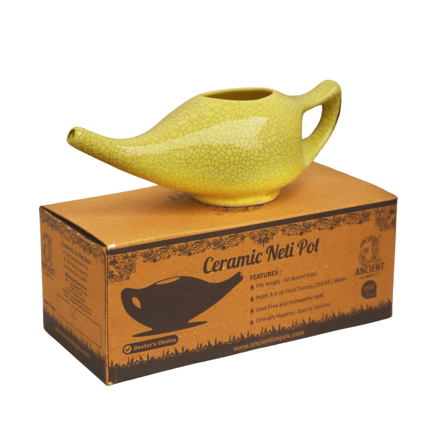Ceramic Neti Pot - Maintain natural nasal health with the ANCIENT IMPEX Ceramic Neti Pot (Crackle Yellow, 250 ml). This premium ceramic neti pot is designed for effective daily nasal cleansing and includes 5 sachets of natural neti salt for convenience. Using this Ayurvedic neti pot supports nasal hygiene, sinus relief, congestion reduction, allergies, and cold symptoms, promoting overall respiratory wellness. Its ergonomic spout ensures smooth, gentle water flow, while the durable ceramic body is safe, reusable, and easy to clean. The vibrant crackle yellow finish adds a decorative touch, making it functional and visually appealing Perfect for home use, yoga practice, travel, or as a thoughtful wellness gift. Choose ANCIENT IMPEX for a natural, sustainable, and effective solution for nasal health.