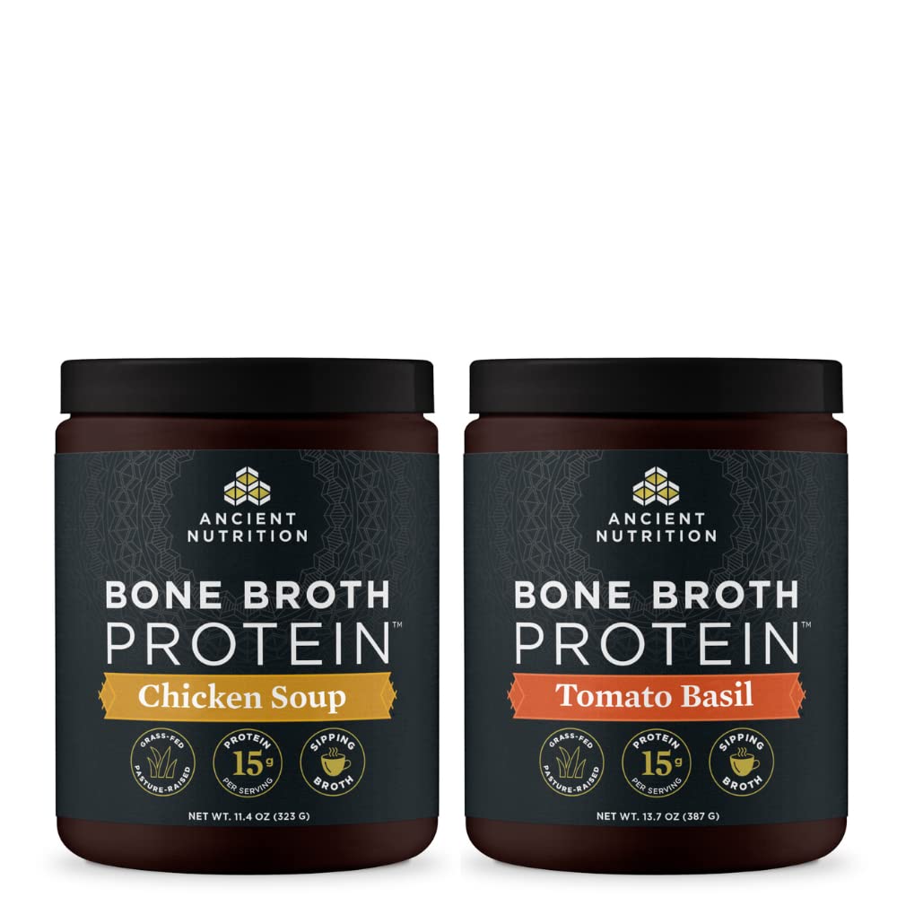 Ancient Nutrition Bone Broth Protein Powder Chicken Soup 15 Servings + Bone Broth Protein Powder Tomato Basil 15 Servings