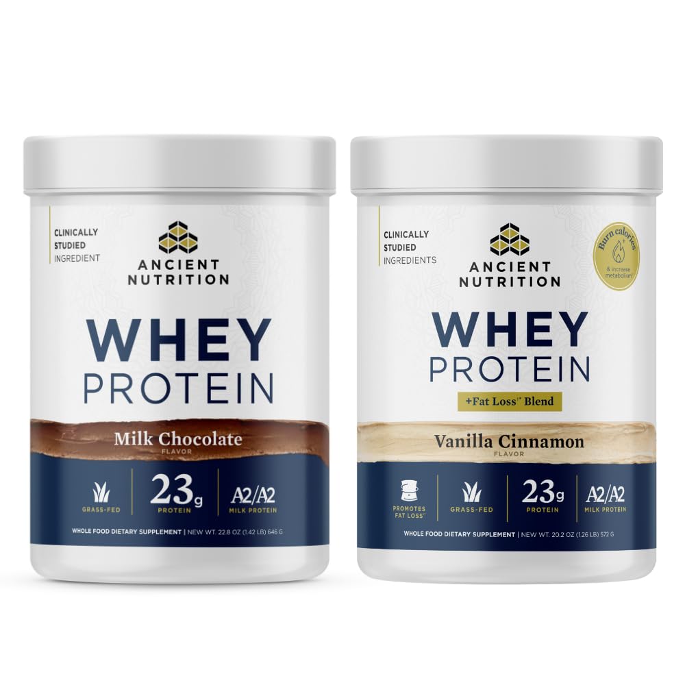 You will receive (1) Grass-fed Whey Protein Powder, Milk Chocolate and (1) Grass-fed Whey Fat Loss Protein Powder by Ancient Nutrition.