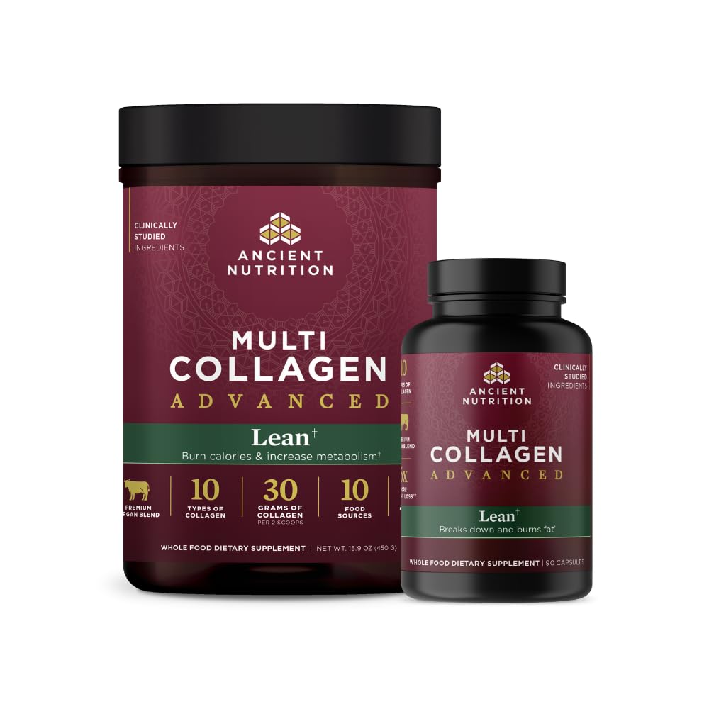 Ancient Nutrition Multi Collagen Advanced Lean Powder, 25 Servings Multi Collagen Advanced Lean Capsules, 90 Count.