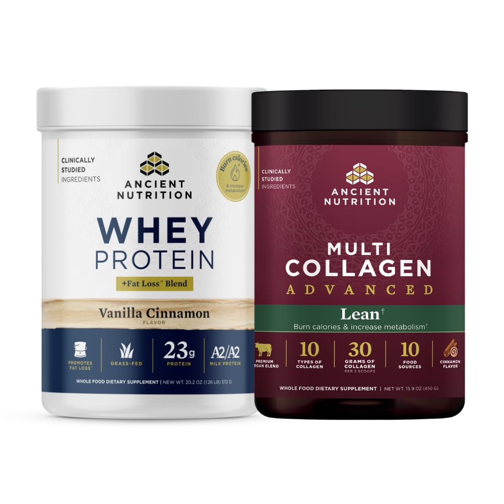 Ancient Nutrition Multi Collagen Advanced Peptides Powder Lean, Cinnamon, 25 Servings Grass-fed Whey Fat Loss Protein Powder, Vanilla Cinnamon, 18 Servings