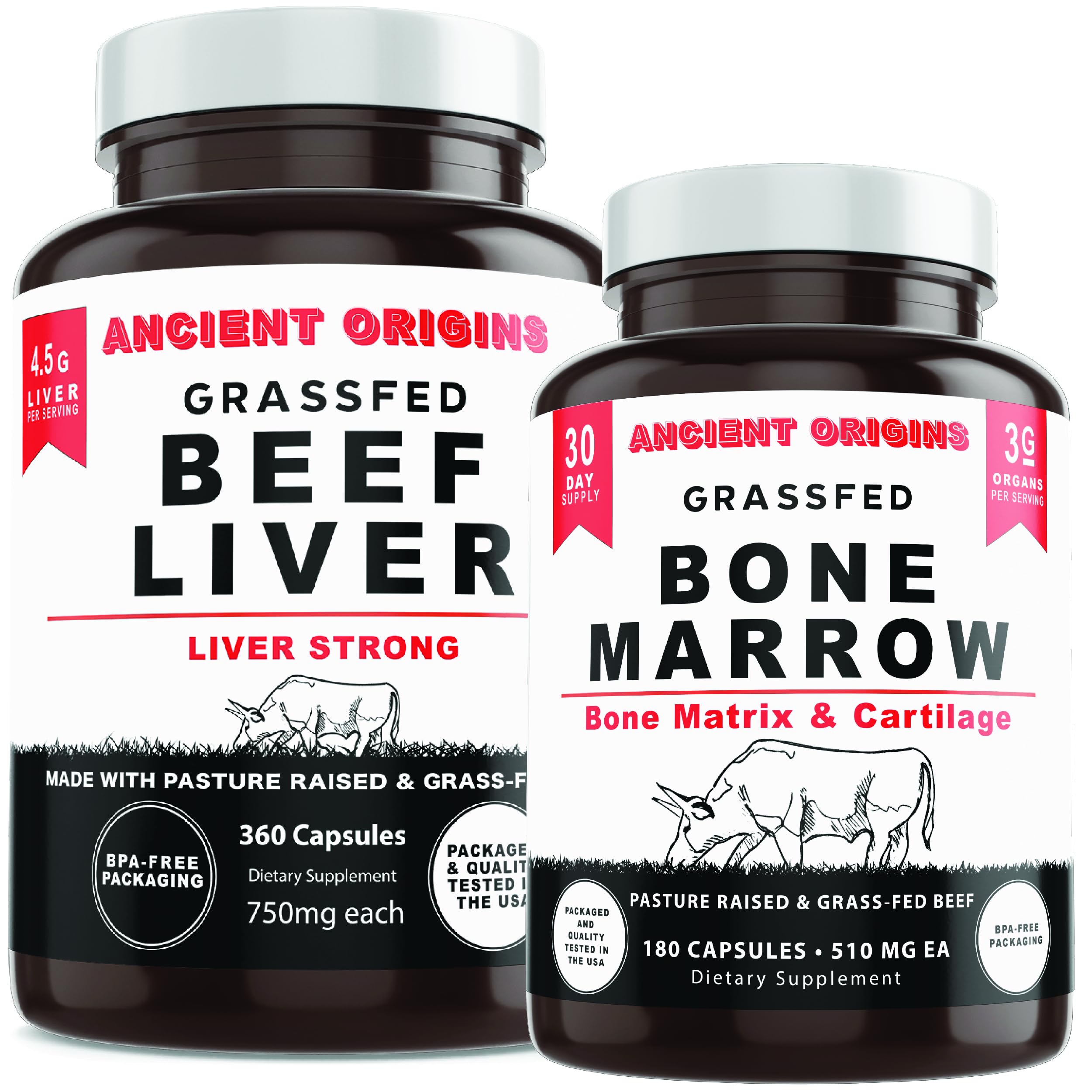 Ancient Origins Grass Fed Beef Liver 360 Capsules 750 mg Each and Bone Marrow 180 Capsules 510 mg Each