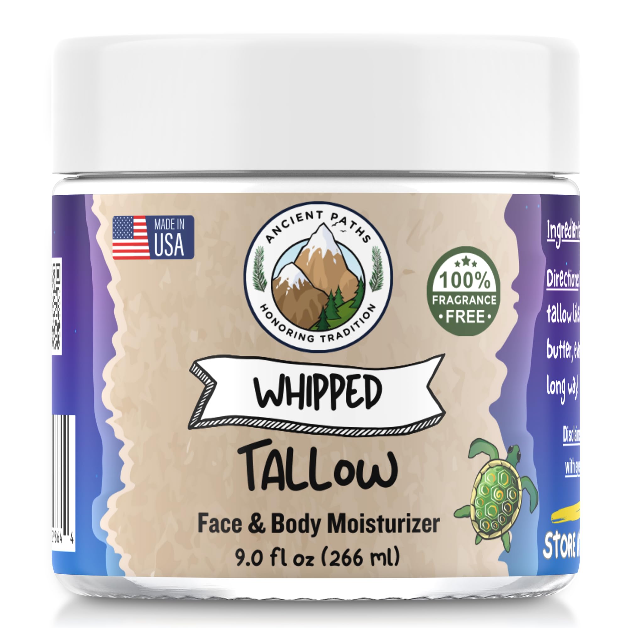 Ancient Paths Whipped Tallow (9oz) - Grass-Fed 100% Natural Beef Tallow Moisturizer - Large Size Face & Body Moisturizer for Women Men & Kids - Fragrance & Preservative-Free - Small Batch USA Made