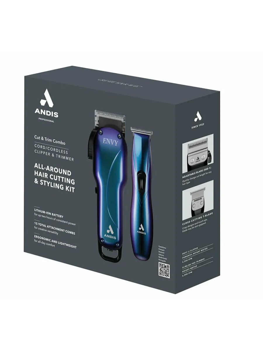 Набор для стрижки волос Combo Galaxy 1. В машинке для стрижки Andis Galaxy Cordless Envy Li Clipper одновременно сочетаются новые технологии и проверенный временем дизайн. Мощный мотор постоянного тока роторного типа, который установлен в машинке, обладает хорошей скоростью – 5500 оборотов в минуту и не имеет ограничений по времени непрерывной работы. Мотор с такой скоростью обеспечивает высокие показатели усилия на срезе.