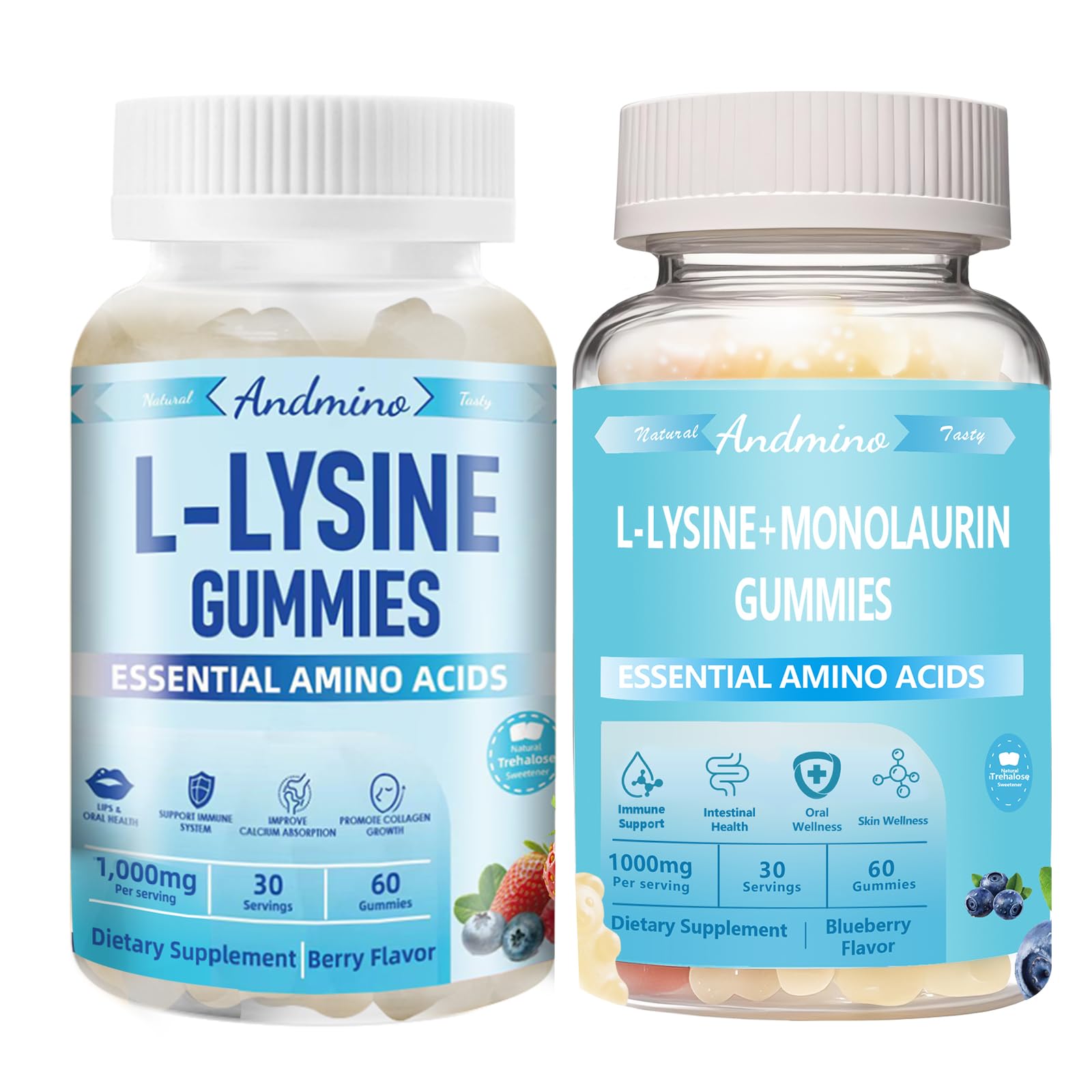 Quality Third Party Tested: Our gummies are produced in a GMP-certified factory no artificial colors and no artificial additives. If you have any problems with our products, please contact us any time. Why Choose Andmino: We Andmino craft plant-based gummies with pectin (not gelatin) for a smooth, enjoyable texture. Free from artificial colors, gluten, and common allergens—because clean ingredients shouldn't compromise taste. Andmino Gummies with Trehalose: Trehalose is a healthy sweetener, with 45 of sucrose's sweetness. Trehalose to support gentle digestion and has antioxidant properties, it's a smarter choice for health-conscious users. Health of L-Lysine: The L-Lysine benefits lip and mouth wellness, Supports immune system and collagen production for adults and kids. Take two gummies daily and easier to take. How It Works: L-Lysine: An essential amino acid that supports the maintenance of healthy tissues and overall wellness. Monolaurin: Derived from coconut, this natural compound supports gut balance and microbial harmony.