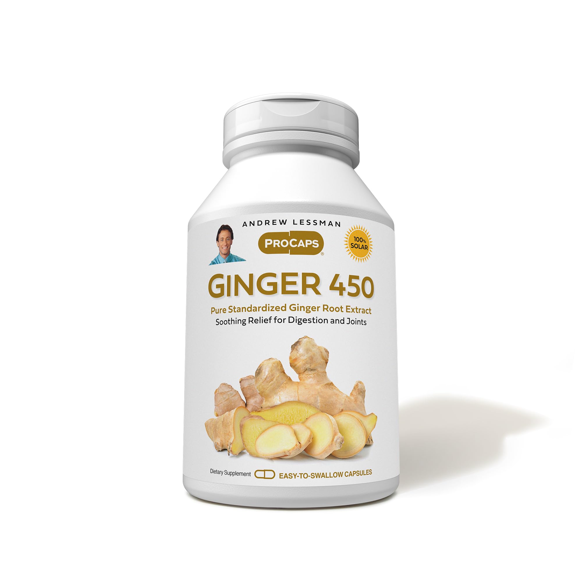 GINGER 450 contains a pure standardized extract of the most important active components from Ginger Root in a small, easy-to-swallow capsule. For more than one thousand years throughout virtually all Asian cultures, Ginger has been employed as both an important spice and a crucial part of traditional medicine. It was among the first spices cultivated in the New World for both its rich flavor and its medicinal properties. It is not surprising to learn that Ginger is closely related to Turmeric, another popular Asian spice possessing powerful protective properties. Ginger has long been recommended as a natural means of calming an upset, sensitive or uneasy stomach. Ginger's soothing benefits have also been observed to extend to our joints and connective tissue. Standardized to deliver no less than 5 Gingerols, our GINGER 450 provides a rich source of protective compounds that offer extensive anti-aging and anti-oxidant protection. Unlike typical Ginger products found on store shelves that are really nothing more than some ordinary spice in a bottle, our GINGER 450 is formulated to ensure the highest levels of the protective compounds you seek.Ethical Eco-friendly. Zero Carbon Footprint - Uniquely committed to your health and the health of the planet, ProCaps' facilities are 100 Solar Powered with a Zero Carbon Footprint and an LEED Gold green building status. All ProCaps bottles are made from 100 recyclable post-consumer resin. Plus, Andrew Lessman and ProCaps are the largest donor of prenatal vitamins in the world (over 2 billion capsules donated to date). ProCaps, the Informed Choice for Nutritional Supplements. Manufacturer direct and made in Henderson, Nevada - Ethical and eco-friendly, ProCaps formulates, manufactures, and controls every aspect of its products: from formulation, ingredient sourcing, production and quality control. ProCaps' facilities are 100 Solar Powered with a Zero Carbon Footprint. All ProCaps bottles are made from 100 recyclable post-consumer resin. Plus, Andrew Lessman and ProCaps are the largest donor of prenatal vitamins in the world (over 2 billion capsules donated to date). Unsurpassed purity, quality efficacy. Won't upset your stomach! - For 40 years ProCaps products have contained no additives of any kind. No binders, fillers, lubricants, stabilizers, flowing agents, preservatives or artificial colors. Easy-to-swallow capsules (no tablets) deliver only the most bioactive vitamins, minerals ingredients in an ultra-fine micro-granulated powder for fast, complete absorption maximum effectiveness. Non-acidic formula is gentle even on most sensitive stomachs. Superior pure bio-active ingredients - Delivers pure standardized extract of Ginger root with no less than 5 Gingerols. Contains no Milk Dairy-Free, Gluten-Free no soy, yeast, wheat, sodium, salt, sugar, fat, cholesterol, color, preservative, common allergens or manufacturing additives. Pure standardized ginger extract for soothing relief for joints and digestion - Contains the most important active components from Ginger Root. Employed as a crucial part of traditional medicine for more than one thousand years throughout all Asian countries. Delivers powerful protective properties and acts as a natural means of calming an upset, sensitive or uneasy stomach. Provides soothing benefits to joints and connective tissue. Offers extensive anti-aging and anti-oxidant protection.