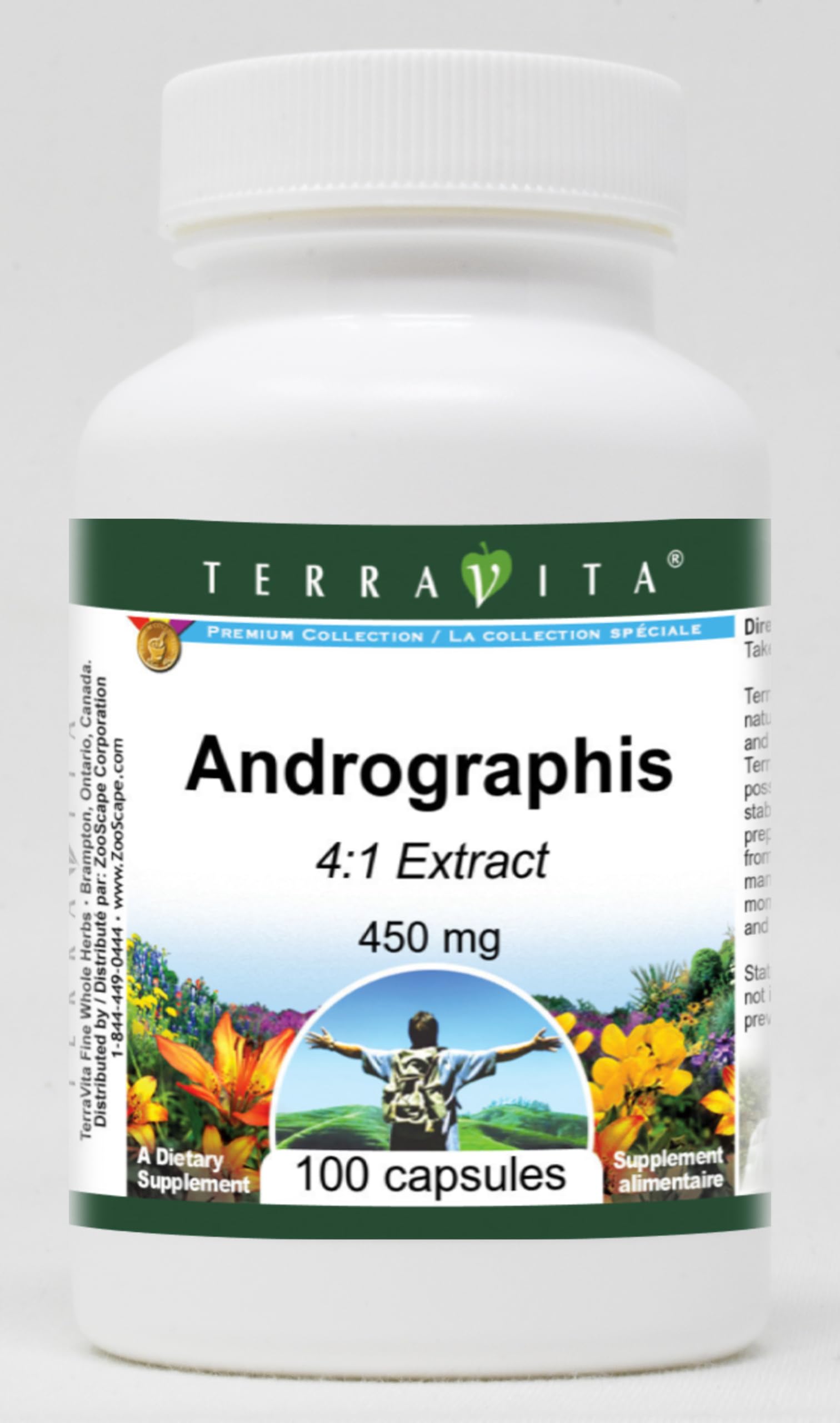 Andrographis 4:1 - 450 mg (100 capsules, ZIN: 518949) Packaged in the United States in a GMP certified facility (Good Manufacturing Practice). No fillers. Manufacturer: TerraVita Size: 100 capsules Easy-to-swallow Capsules in a sealed bottle. Ingredients: Gelatin, Water, Andrographis 4:1 Extract - 450 mg