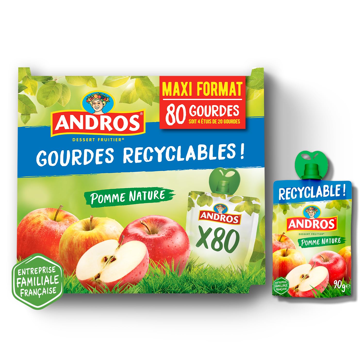 DESCRIPTION DU PRODUIT DESCRIPTION DU PRODUIT ANDROS GOURDE P NATURE SSA PDF 12X90G. Andros Gourdes recyclables Sans Sucres Ajoutés pomme nature 12 gourdes de 90g. 1re gourde recyclable pour les desserts fruitiers. INGRÉDIENTS Ingrédients : pommes 95 , sucre, antioxydant : acide ascorbique. AVERTISSEMENT DE SÉCURITÉ Après ouverture la gourde peut être consommée dans les 24h si elle a été refermée et conservée au réfrigérateur. Voir plus