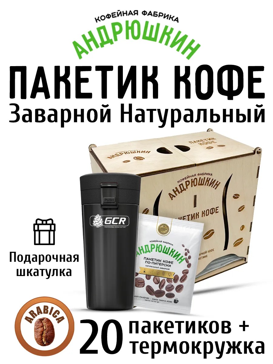 АНДРЮШКИН Кофе в подарок в шкатулке 20 пакетиков +термокружка