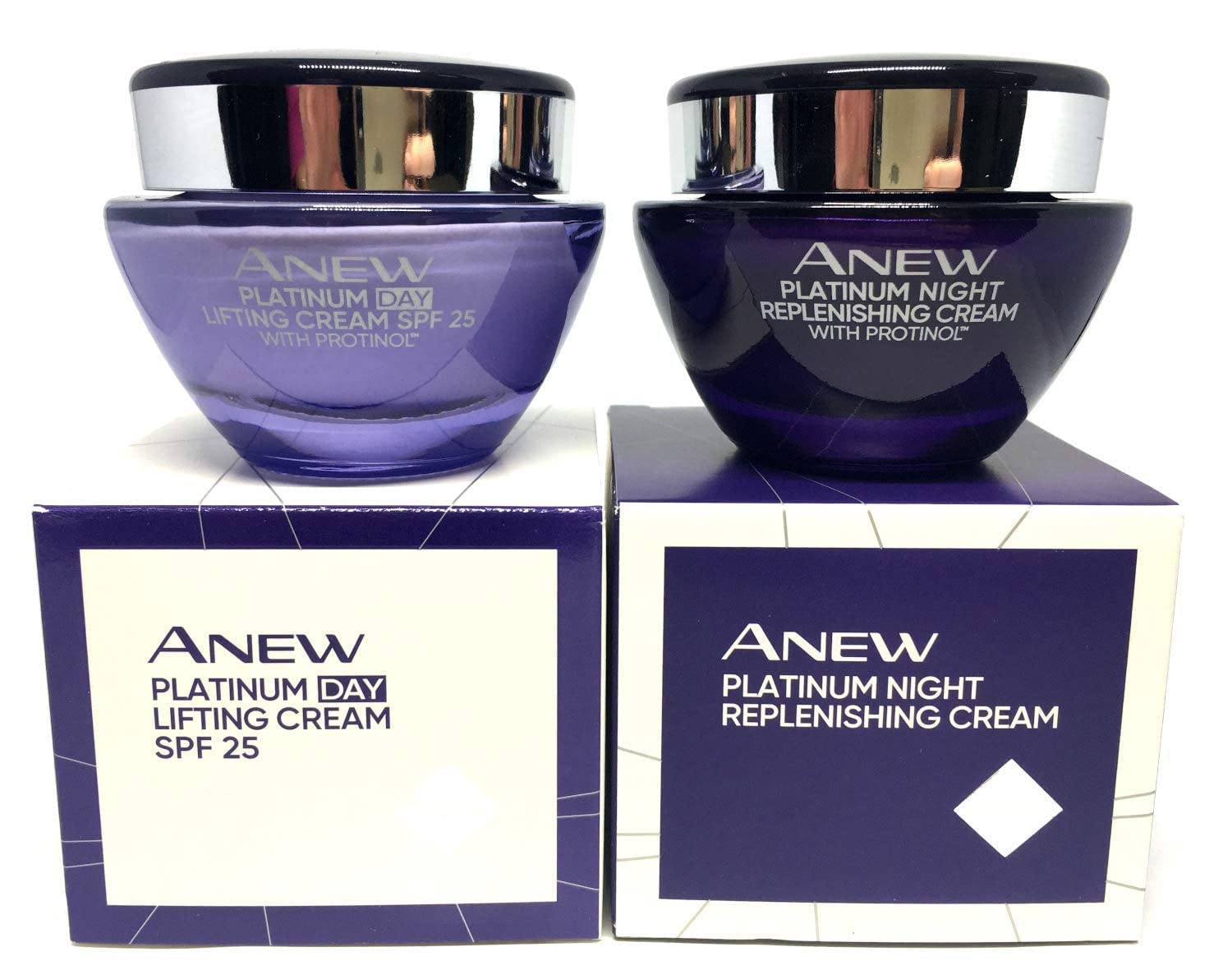 Avon Anew Platinum Day Cream and Night Cream.... Firm, smooth and hydrate your skin with Anew Platinum Day Lifting Cream, our new and improved formula with a dual collagen boost for results in 2 days. Enhanced with added Protinol Technology, it's clinically shown to increase skin’s moisture immediately*, and help reactivate your skin’s own elastin production by 53% in just 2 days**. Avon Anew Platinum Day Cream & Night Cream SET. Visibly reduce wrinkles and skin discoloration. Get younger-looking skin with contour sculpting Paxillium Technology. Firm, lift and smooth facial skin, Suitable for sensitive skin. Hypoallergenic and non-comedogenic, Allergy-tested and dermatologist-tested. 2 packs of 1.7 Fl oz each (3.4 Fl oz total). Anew Platinum Day Cream and Night Cream.... Firm, smooth and hydrate your skin with Anew Platinum Day Lifting Cream, our new and improved formula with a dual collagen boost for results in 2 days. Enhanced with added Protinol Technology, it's clinically shown to increase skin’s moisture immediately*, and help reactivate your skin’s own elastin production by 53% in just 2 days**. Avon Anew Platinum Day Cream & Night Cream SET. Visibly reduce wrinkles and skin discoloration. Get younger-looking skin with contour sculpting Paxillium Technology. Firm, lift and smooth facial skin, Suitable for sensitive skin. Hypoallergenic and non-comedogenic, Allergy-tested and dermatologist-tested. 2 packs of 1.7 Fl oz each (3.4 Fl oz total).