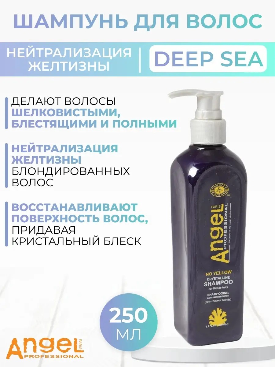 No Yellow Chrystalline Shampoo для светлых волос содержит комбинацию масла ши, цветка розы Rostif Centifolia и масла апельсина для создания яркого, сияющего блеска в светлых волосах при нежном очищении. Питательные и разглаживающие свойства Padina pavonica делают волосы шелковистыми, блестящими и полными.Шампунь для нейтрализации желтизны Angel Professional Crystalline подходит для обесцвеченных, блондированных, мелированных или седых волос. Содержит синие пигменты для нейтрализации желтизны блондированных волос. Комбинация масел Ши, Розы Столистной и Цветка Апельсина восстанавливают поверхность волос, придавая кристальный блеск. За счет мягкой формулы не нарушает липидный баланс кожи головы. Способ применения: нанесите небольшое количество шампуня на мокрые волосы, вспеньте, оставить на 1 - 2 минуты, затем тщательно смойте. При необходимости повторите процедуру.