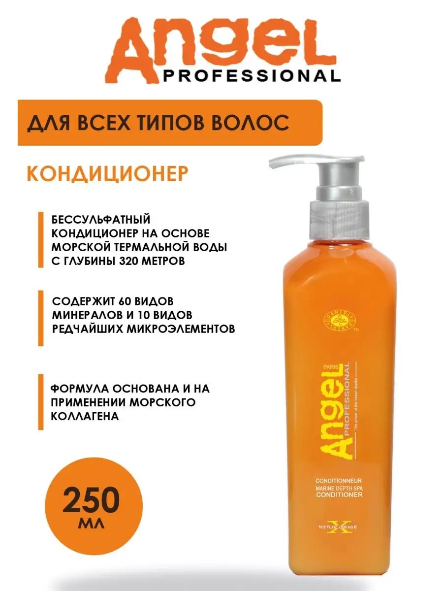 Кондиционер Angel Professional для всех типов волос создан на основе термальной воды, которая добывается из впадины в океане из термального источника с глубины 320 метров. Ее уникальное действие состоит в том, что она содержит в своем составе 60 видов минералов и 10 видов редчайших микроэлементов - это настоящий витаминный эликсир, который проникает в структуру волос и возвращает им жизненную силу, упругость и блеск. Его уникальная формула основана и на применении морского коллагена, который отлично проникает в структуру волоса и усваивается, наполняя локоны здоровьем и силой на клеточном уровне, позволяя влаге удерживаться внутри волоса. Также в составе эссенция морских водорослей для защиты волос от негативного влияния окружающей среды и их восстановления, фруктовые кислоты и масла. Кондиционер концентрированный и именно поэтому достаточно небольшого количества средства для мытья головы. Хватает его надолго - в этом секрет профессиональных средств от Ангел профессионал ! Производитель Dancoly ( Франция ). Способ применения: После применения шампуня или маски для волос в качестве финального этапа мытья головы нанести кондиционер на длину волос. Его нужно наносить, начиная от середины волос и заканчивая концами, при этом волосы должны быть очень мокрыми. Распределить его по прядям, прочесывая их пальцами, движениями сверху вниз. Чтобы продукт полностью и равномерно покрыл волосы. Можно воспользоваться расческой с широкими зубчиками. Количество продукта отмеряют индивидуально, в зависимости от длины и густоты шевелюры. Использовать слишком много кондиционера неэкономно, принцип чем больше, тем лучше в данном случае не работает. Средство выдерживается на волосах совсем недолго, обычно это 1-3 минуты, которых кондиционеру или бальзаму- ополаскивателю вполне достаточно, чтобы закрыть кутикулу. Тщательно и полностью смыть. Смывать кондиционер желательно не горячей, а теплой водой. Применять кондиционер для волос нужно всякий раз, когда вы моете голову.