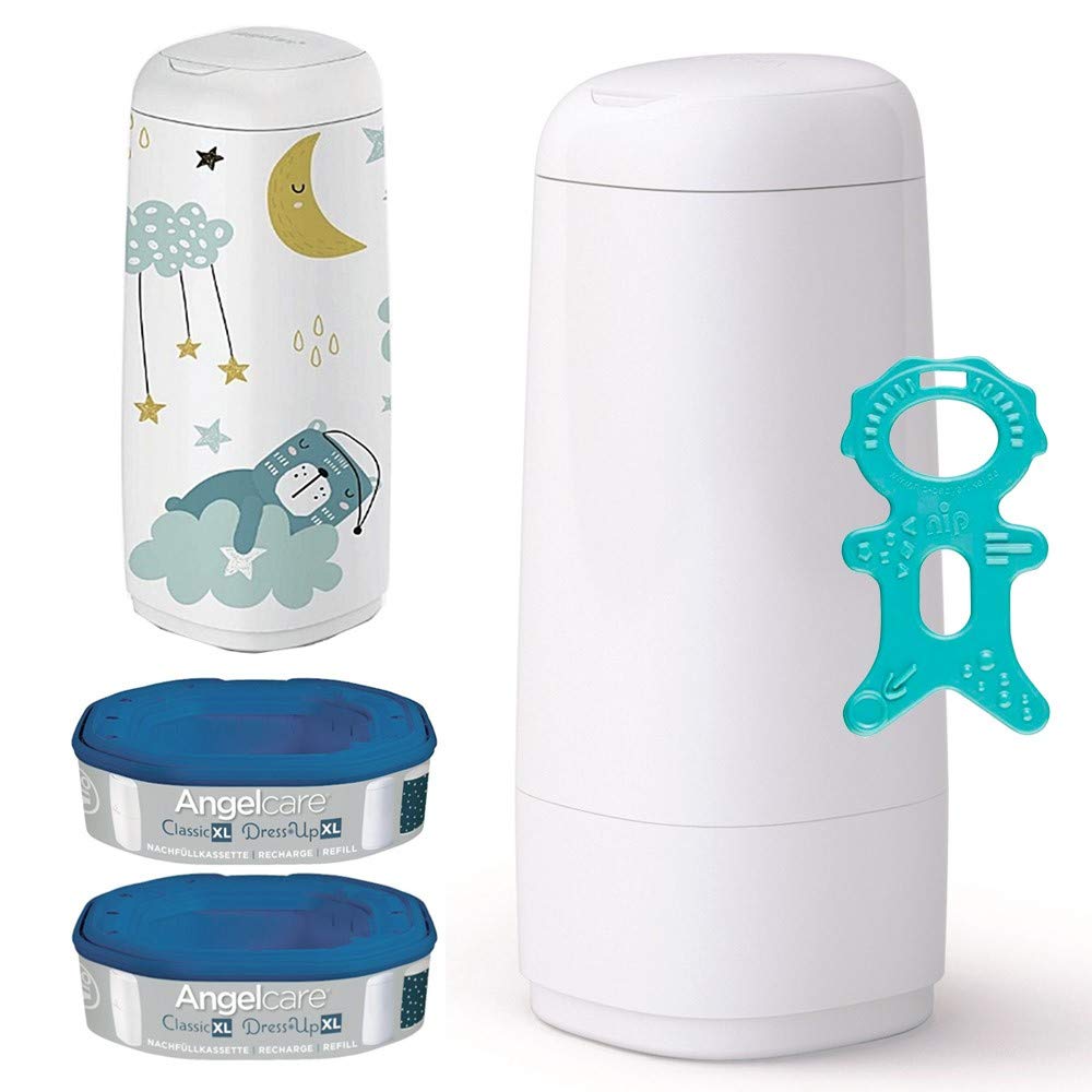 Der Angelcare Windeleimer Dress-Up XL (66 cm) ist aufgrund seiner ergonomischen Höhe besonders rückenfreundlich. Antibakteriell beschichtete Folie zur Keimbekämpfung Umweltschonend durch geringen Folienverbrauch. 2x mehr Windeln pro Nachfüllkassette als Nachfüllkassetten für Windeleimer mit Eindrehsystem . 5x bessere Geruchsbarriere als Folien für Windeleimer mit Eindrehsystem . Zum Lieferumfang gehören: 1 x Angelcare Windeleimer Dress-Up XL 1 x Angelcare Dress-Up Bezug ""Sleepy Bear"" 2 x Angelcare Nachfüllkassette GRATIS 1 x Original NIP Beißmännchen Zahnungshilfe Beißring.