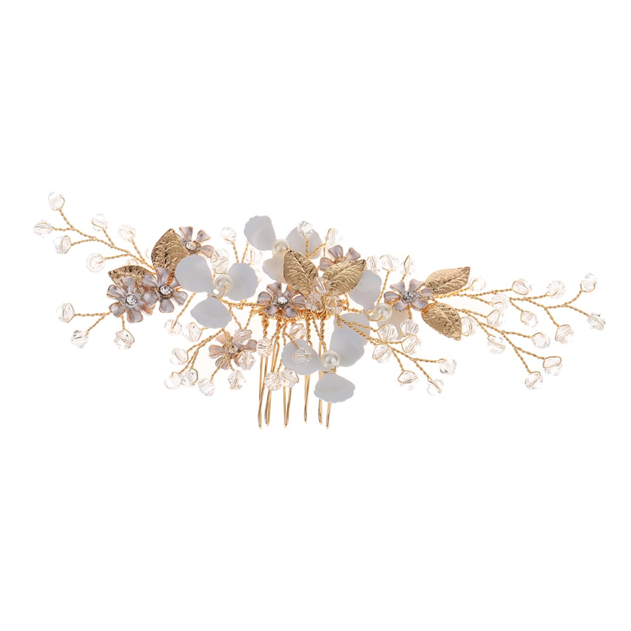 Package List 1 x Hair comb Features - Material: Alloy bridal hair accessories. - Color: Gold. - Size: About 19 x 15.5cm. - The chic design will make you elegant and beautiful. You will attack everyone's eyes and be the spot light in the crowd bridal hair comb. - for wedding, engagement, prom, party, etc hair side combs. - Classic and elegant style with crystals, gold leaves and decoration crystal hair comb. wedding hair comb bridal side combs - Lightweight and comfortable to wear. Goods Description bridal hair comb The elegant and exquisite design will ensure its practicability and popularity.wedding hair comb Such a beautiful hair accessory will make brides more attractive and charming.hair side combs This item is manufactured with for durable and long-lasting use