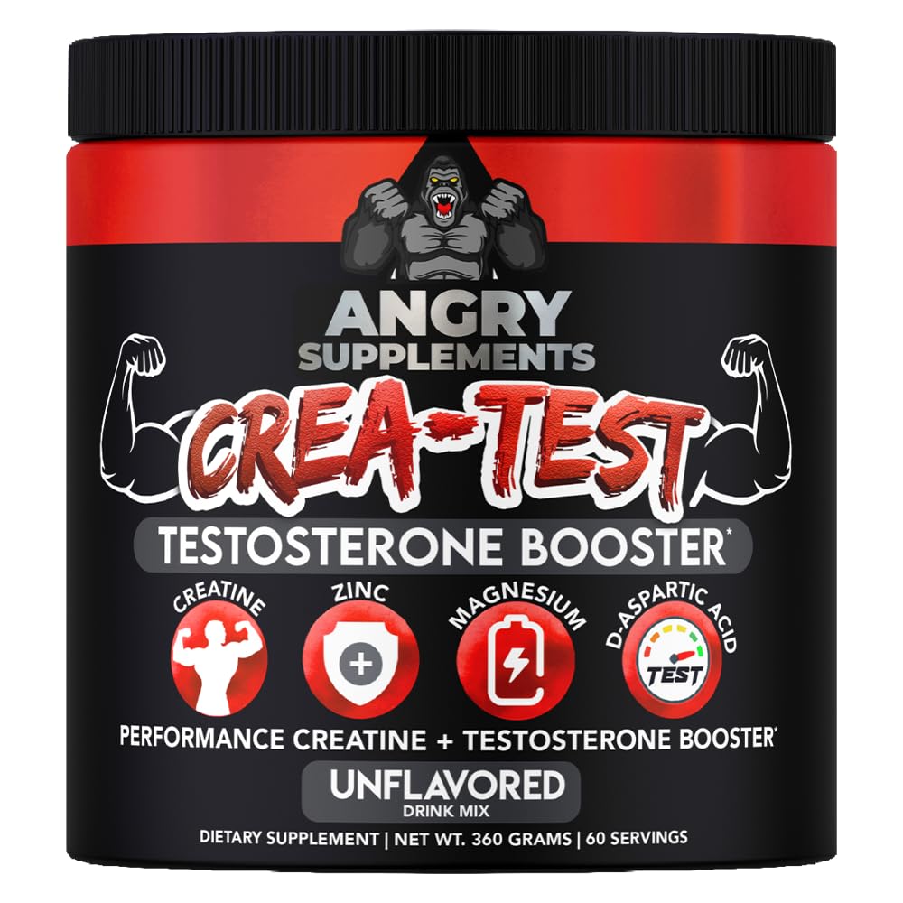 ENHANCED WITH MINERALS: CREA-TEST also includes Magnesium Oxide which is essential for various bodily functions and contributing to overall well-being. Zinc Oxide is also an important mineral for immune function and overall health, complementing our comprehensive male centric formula. MADE FOR MEN! By combining Creatine with Test Boosting ingredients like D-Aspartic Acid, we have enhanced the most well known workout supplement to make it better for males looking to enhance their workouts and body. D-Aspartic Acid is known for its potential to support healthy test levels, contributing to improved vitality and energy. UNFLAVORED VERSATILITY- EASY TO USE: Mix our unflavored CREA-TEST Powder easily with your favorite beverage or protein shake for a customizable and convenient way to incorporate CREA-TEST into your daily routine. Get all the benefits without the nasty chemical colors or flavors! Our premium powder form allows for easy mixing and consumption, making it a convenient addition to your pre or post-workout routine!. CREATINE 200 MESH SUPERIOR SOLUBILITY: Our Premium Quality CREA-TEST is crafted with 100 Pure Creatine Monohydrate that is 200 Mesh. The mesh size of creatine refers to the particle size of the creatine powder, a smaller mesh number means larger particle size, while a LARGER mesh number, like in CREA-TEST, indicates smaller particle size and has superior solubility in liquids, compared to lower quality creatine. CREA-TEST may dissolve much more easily in water or other beverages, leading to a smoother and more easily consumed drink!. 2in1 TEST BOOSTING CREATINE SUPPLEMENT: Why purchase a Test Booster and Creatine in separate supplements wasting both your time and money, when you can combine the powers of both in Angry Supplements CREA-TEST! Our premium performance powder contains 100 Creatine Monohydrate 200 Mesh, D-Aspartic Acid, Zinc and Magnesium. CREA-TEST is unflavored, high quality, and easy to use!.