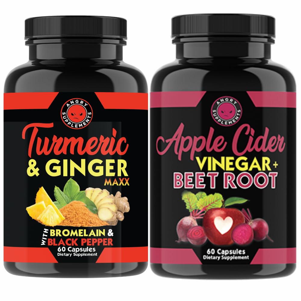 Angry Supplements Turmeric Ginger Maxx + Apple Cider Vinegar with Beet Root 2-Pack Wellness Bundle Supports Energy Digestion and Daily Vitality Natural Herbal Capsules for Men & Women