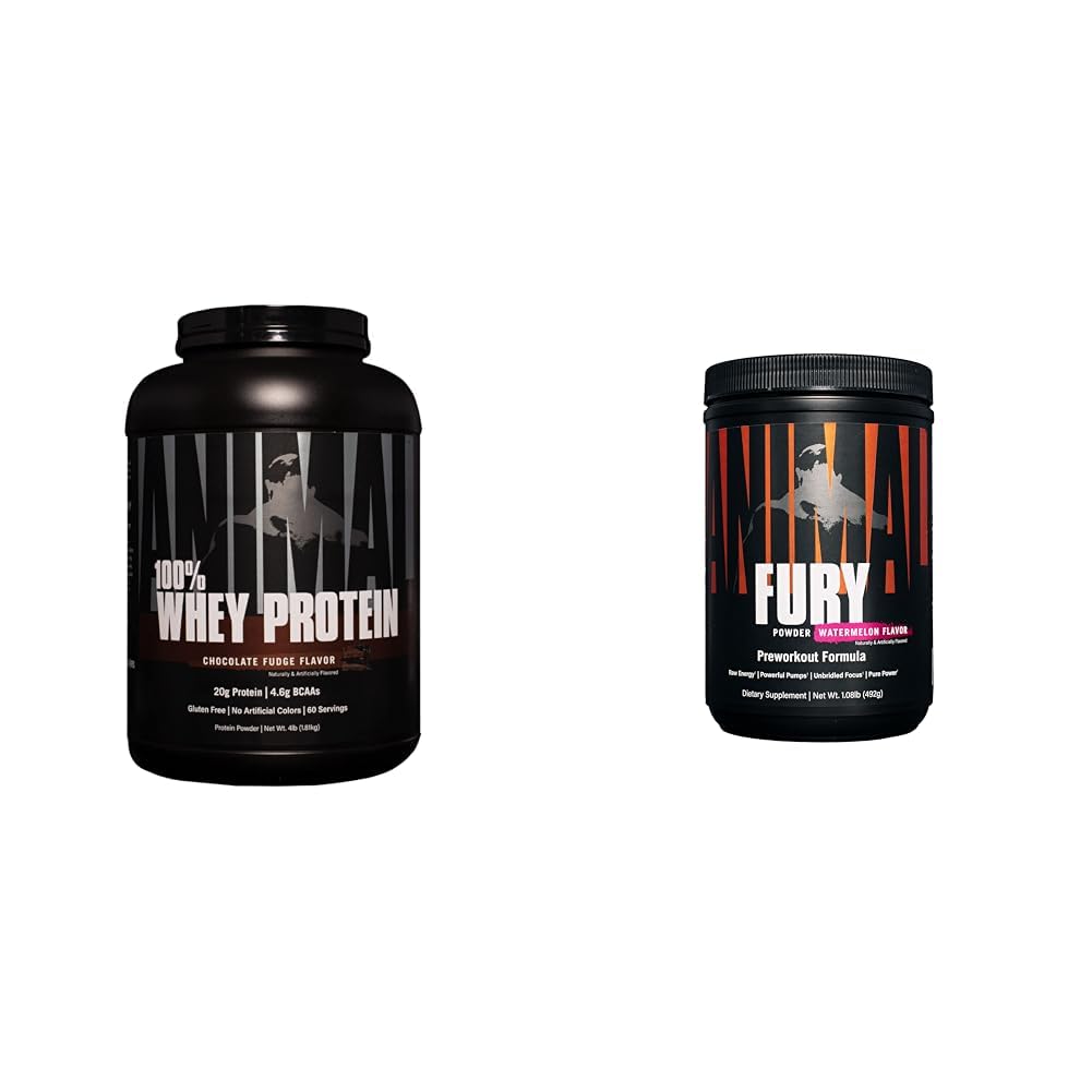 Animal 100% Whey Protein Powder – Whey Blend for Pre- or Post-Workout, Recovery or an Anytime Protein Boost– Low Sugar – Chocolate, 4 lb (Packaging may vary) There is no more critical staple in the supplement regimen of an athlete than protein powder. It’s a perfect way of filling the gaps bridging whole-food meals, providing a concentrated dose of the most important macronutrient for bodybuilding – protein. Animal 100% Whey is 20g of pure protein fuel, without the excess sugar and carbs that can slow you down, whether you’re looking to add lean muscle or just add an extra boost of protein to your diet to stay healthy and fit. Each serving is loaded with 4.6g of BCAAs, key for repairing and building new muscle. This great-tasting protein is perfect for any athlete, anytime and anywhere, Animal 100% Whey Protein is our most versatile protein yet. No unnecessary fillers, just a pure concentrate-isolate blend to get the results you want and that tastes great! Animal Fury Pre Workout Powder Supplement for Energy and Focus 5g BCAA 350mg Caffeine Nitric Oxide Without Creatine Powerful Stimulant for Bodybuilders, Watermelon, Watermelon, 16.96 Ounce Animal Fury Pre Workout Powder Supplement a Energize Your Workout With More Focus, Energy, Endurance and Pumps, Watermelon - 30 ServingsProduct 2: Creatine free formula is perfect for any athlete in a bulk or cut season. A no non-sense formula designed for both men and women. Product 2: Animal Fury powder mixes easily in 12oz. of water or your drink of choice, and packs a powerful and delicious taste for all athletes. Vein popping pumps, nitric oxide, high energy and focus every single workout. Product 2: Product Note: Exposure to heat or sunlight may lead to melting/damage of product. Hence customers are expected to be available during the product delivery. Product 2: 5g BCAA, 6g Citrulline Malate, 2g Beta Alanine, 1g L-Tyrosine, 350mg Caffeine. Combined for a powerful preworkout energy drink suplement. Each container contains 30 servings. Product 1: Made to the Highest Quality & Safety Standards: All of our products are produced in our GMP certified US plant, and every batch is 3rd party lab tested in a pharmaceutical grade facility for quality, safety and potency. Product 1: Creamy & Delicious Anytime, Anywhere: Mixes easily and tastes great, with no chalky aftertaste and only 1g of sugar; throw some in your bag for any time extra protein is needed, including breakfast, in between meals, and pre- and post-workout. Product 1: Naturally High in BCAA: Our 100% Whey Protein provides over 4.6g of naturally occurring Branched Chain Amino Acids (BCAA) that help grow and repair body tissue. Product 1: 20g of Protein per Scoop: Animal 100% Whey is pure protein fuel, formulated with a high quality whey protein blend to fuel muscle growth and improve recovery.