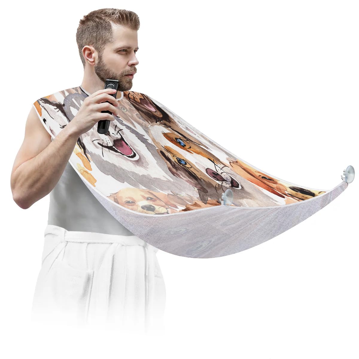 fiber fabric, ensuring exceptional quality. The fabric has a smooth and soft surface that is not sticky to hair, making it comfortable to wear during grooming sessions. It is also waterproof and anti-static, further enhancing its practicality. In addition, it is equipped with two high-quality suction hooks that provide powerful suction without leaving marks on mirrors or tiles. ?Convenient and Easy to Use?: Using our beard hair catcher is a breeze. Just fasten it around your neck using the adjustable strap and secure it to the mirror. Once in place, you can effortlessly proceed with your regular grooming routine. When you're done, simply remove the beard bib from the suction cups. Then brush the collected hair into the trash can for easy cleanup. ?Effortless Hair Cleanup?: Our Animal Dog Painting beard bib is expertly designed to capture all loose beard hair, mustache, and sideburn trimmings, providing effortless cleanup and keeping your sink immaculately clean. This saves you valuable time that would otherwise be spent on tedious cleaning tasks. Not only does it serve a practical function, but it also adds a stylish touch to your daily grooming routine.