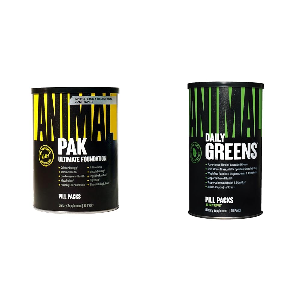 Animal Pak - Convenient All-in-One Vitamin & Supplement Pack - Zinc, Vitamins C, B, D, Amino Acids and More - Sports Nutrition Performance Mulitvitamin for Women & Men - Updated Version - 30 Count Working with nutritionists, physical science experts, and athletes, we are advancing America’s #1 training Pak, again, with powerhouse ingredients designed to take your workouts to an even higher level and delivered in an all-in-one pill pack that’s even easier and more convenient. Our upgraded PAK now: Includes Spectra™ , an all-natural blend of 29 fruits, vegetables, and herbs to help increase blood flow to muscles and support cellular energy through improved oxygen Boosted with spirulina, chlorella, and ginkgo biloba help further charge the body’s natural immune response Optimized nutritional values to meet the daily needs of athletes Enhanced with AstraGin® to help improve nutrient bioavailability Concentrated formula delivering the benefits of 12 supplements in one convenient packet, now with 25% less pills (8 pills) Animal Greens Pak - Chlorophyll, Spectra, Superfood Whole Food Prebiotic and Probiotic Super Digestion Blend for Gut Health, Immune Support, Convenient Daily Pill Packs, 30 Count Animal greens is nothing short of amazing. It is a complete, optimally calibrated and balanced antioxidant-rich nutrition powerhouse. It perfectly dials in and delivers a novel formula based on well researched natural compounds found in greens like kale, wheat grass, alfalfa, Spirulina, chlorella and more. No longer for the nuts and berry types, strength Athletes everywhere, of every kind now know the value of eating your veggies - These potent veggies.Product 2: Packed with phytonutrients, antioxidants, and Digestive ingredients. Product 2: Helps strengthen immune system and overall health. Product 2: Convenient on the go solution for a well balanced Veggie, prebiotic, greens boost. Product 2: Animal greens pack is delivered in a pack of pills and capsules so there is no nasty after taste of a greens powder. Product 1: Made to the Highest Quality & Safety Standards: All of our products are produced in our GMP certified US plant, and every batch is 3rd party lab tested in a pharmaceutical grade facility for quality, safety and potency. Product 1: Grab & Go Convenience: Each dose of Animal Pak is in its own individual pack that you can throw in your gym bag, work bag, or just leave it in the tin; no messy powder, no spilling, no clumping. Product 1: Complete Nutrition, 12 Essential Products in 1: Containing multiple vitamins, minerals, amino acids, antioxidants, digestive enzymes, carnitine, and much more, Animal Pak is the cornerstone for any athlete’s nutrition. Product 1: Make Your Hard Work, Work Harder: Animal Pak is formulated to help athletes like you fill nutritional gaps and strengthen your body’s foundation to help optimize your physical and mental wellness and fitness goals.