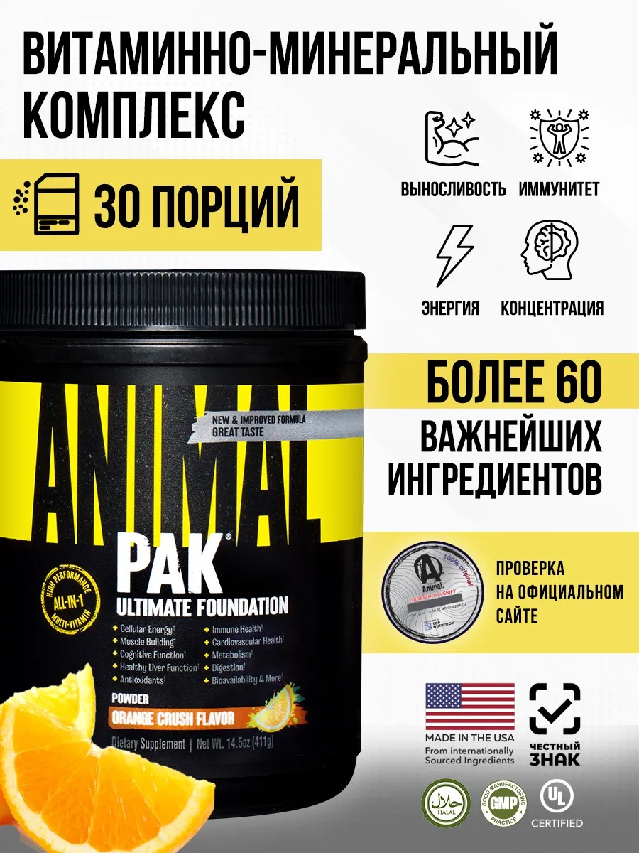 Animal Pak - это мощный комплексный мультивитаминный продукт, созданный специально для серьезных атлетов и фитнес-энтузиастов. Продукт имеет множество преимуществ и может улучшить результаты в тренировках и повысить уровень общей физической подготовки. Animal Pak содержит более 60 ингредиентов, включая витамины, минералы, аминокислоты, антиоксиданты, ферменты, липотропные вещества и другие питательные компоненты. Некоторые из основных компонентов и их действия: • Витамины и минералы: участвуют в метаболических процессах, поддерживают иммунную систему, регулируют функции организма. • Аминокислоты: строительные блоки белка, участвуют в синтезе белковых структур, поддерживают здоровье мышц. • Антиоксиданты: защищают клетки от свободных радикалов, которые могут повреждать ДНК и другие клеточные компоненты. • Ферменты: участвуют в процессах пищеварения, обеспечивают более эффективное усвоение питательных веществ. • Липотропные вещества: ускоряют метаболизм жиров, помогают снижать уровень холестерина в крови. • Другие питательные компоненты: такие как экстракты растений, пробиотики и дополнительные антиоксиданты, которые помогают поддерживать общее здоровье.В совокупности, эти компоненты помогают улучшить общее здоровье и производительность, повышают уровень энергии, ускоряют восстановление после тренировок, укрепляют иммунную систему и обеспечивают оптимальную поддержку метаболизма. Продукт может улучшить выносливость, ускорить восстановление, увеличить мышечную массу и силу, повысить уровень энергии и улучшить общую физическую подготовку. Universal Nutrition - это проверенная временем семейная компания, которая известна своей высокой степенью качества и эффективности продуктов. Animal Pak производится в соответствии с самыми высокими стандартами качества и безопасности.Animal Pak может быть эффективным выбором для тех, кто ищет комплексное питание для своего организма, чтобы достичь наилучших результатов в тренировках и повысить общую физическую подготовку.